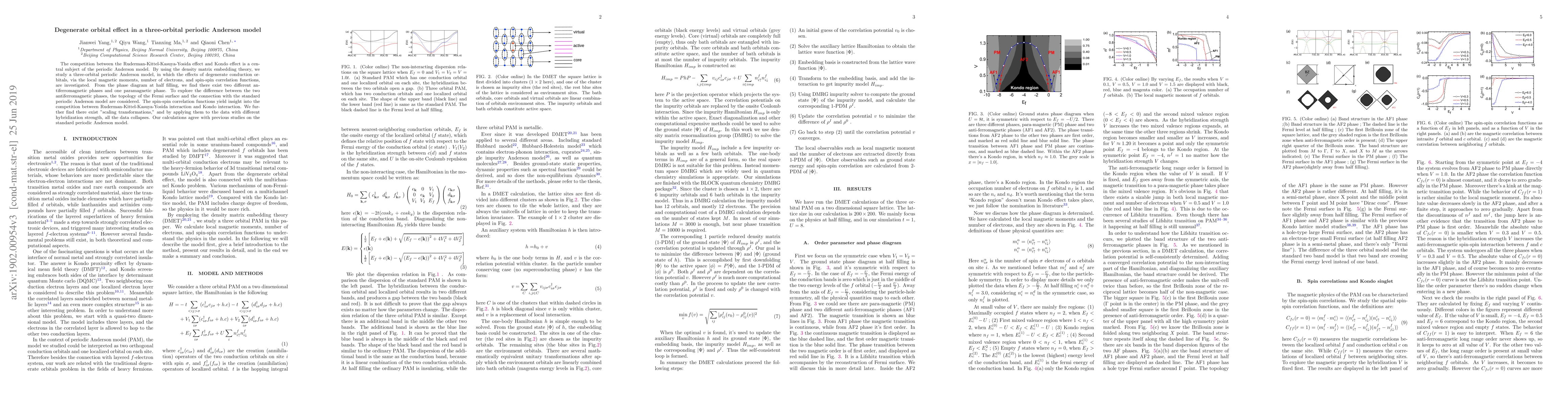 This paper investigates the degenerate orbital effect in a three-orbital periodic Anderson model using density matrix embedding theory, revealing two distinct anti-ferromagnetic phases and a paramagnetic phase. The study highlights the interplay between Ruderman-Kittel-Kasuya-Yosida and Kondo interactions, and identifies a "scaling transformation" linking different hybridization ratios.