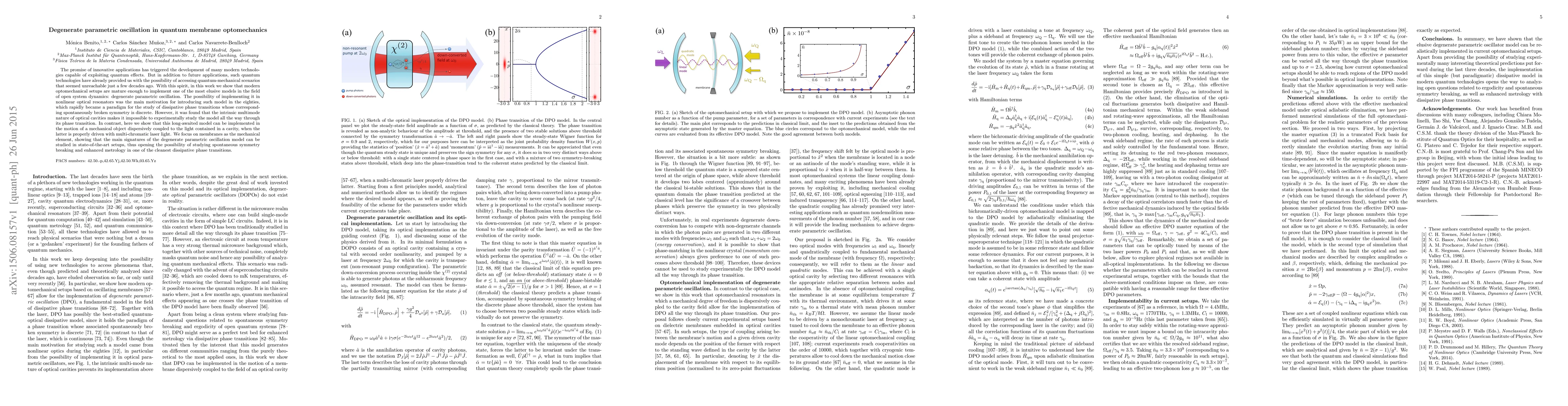 This paper demonstrates the implementation of degenerate parametric oscillation in quantum membrane optomechanics, a model previously elusive in optical cavities due to their multimode nature. The study shows that modern optomechanical setups can now realize this paradigm, enabling the study of spontaneous symmetry breaking and enhanced metrology.