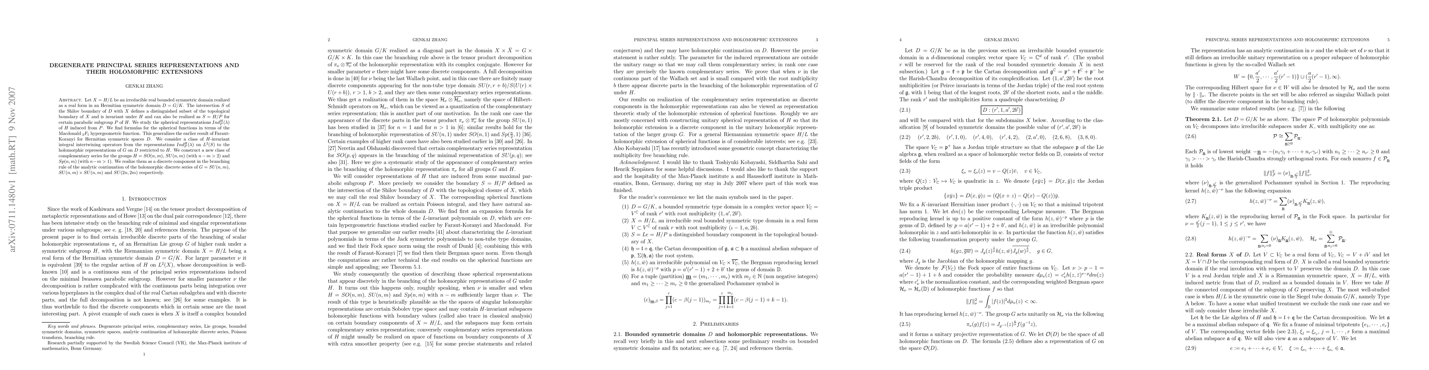 This paper studies degenerate principal series representations of $H$ induced from parabolic subgroups $P$, focusing on their holomorphic extensions. It provides formulas for spherical functions using the Macdonald ${}_2F_1$ hypergeometric function and constructs new complementary series for specific groups, realizing them as discrete components in the analytic continuation of the holomorphic discrete series.