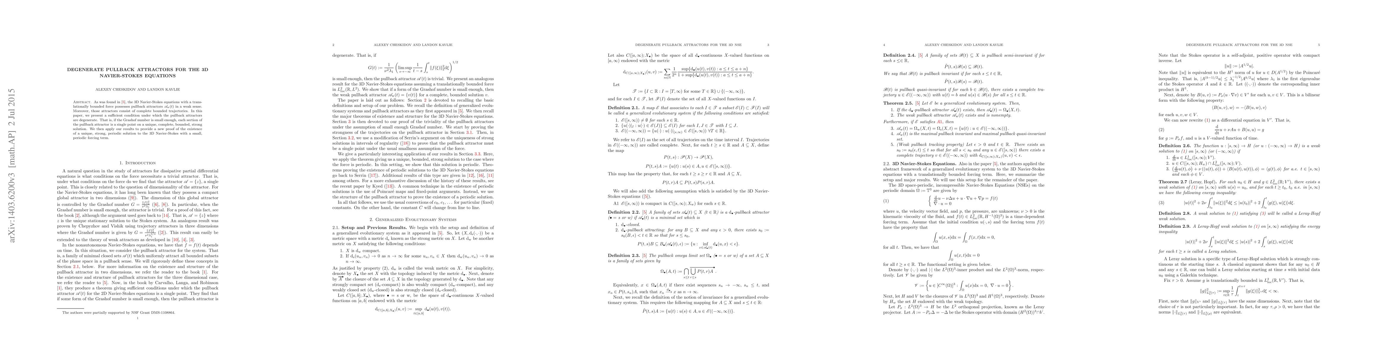As in our previous paper, the 3D Navier-Stokes equations with a translationally bounded force contain pullback attractors in a weak sense. Moreover, those attractors consist of complete bounded trajectories. In this paper, we present a sufficient condition under which the pullback attractors are degenerate. That is, if the Grashof constant is small enough, the pullback attractor will be a single point on a unique, complete, bounded, strong solution. We then apply our results to provide a new proof of the existence of a unique, strong, periodic solution to the 3D Navier-Stokes with a small, periodic forcing term.