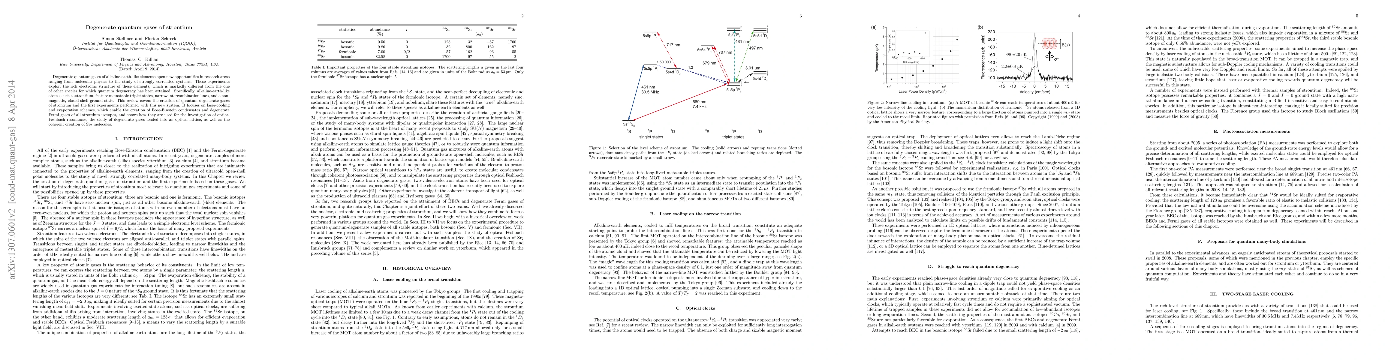 This paper reviews the creation and experimental exploration of degenerate quantum gases of strontium, highlighting laser-cooling and evaporation techniques for producing Bose-Einstein condensates and degenerate Fermi gases. It discusses applications in studying optical Feshbach resonances, degenerate gases in optical lattices, and the coherent formation of Sr_2 molecules.