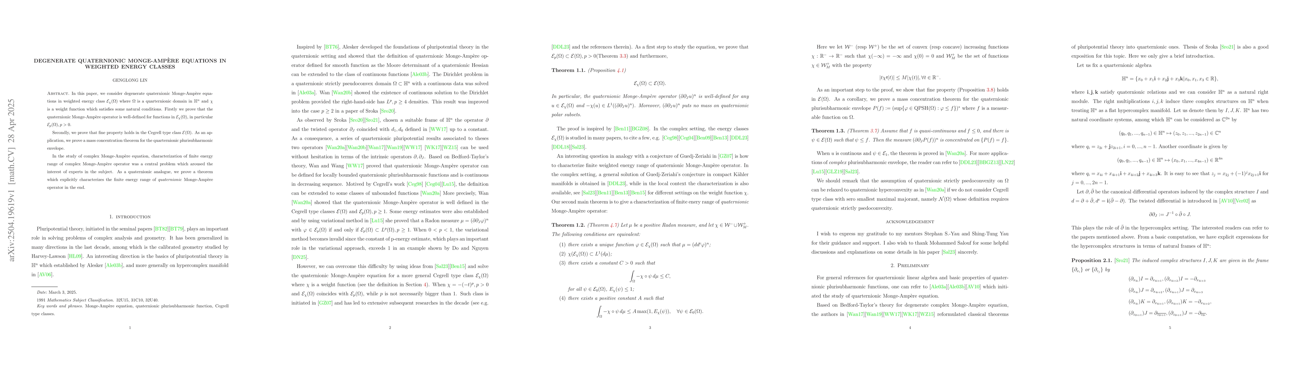 This paper investigates degenerate quaternionic Monge-Ampéere equations in weighted energy classes, proving the operator is well-defined for certain functions and showing a mass concentration theorem as an application.