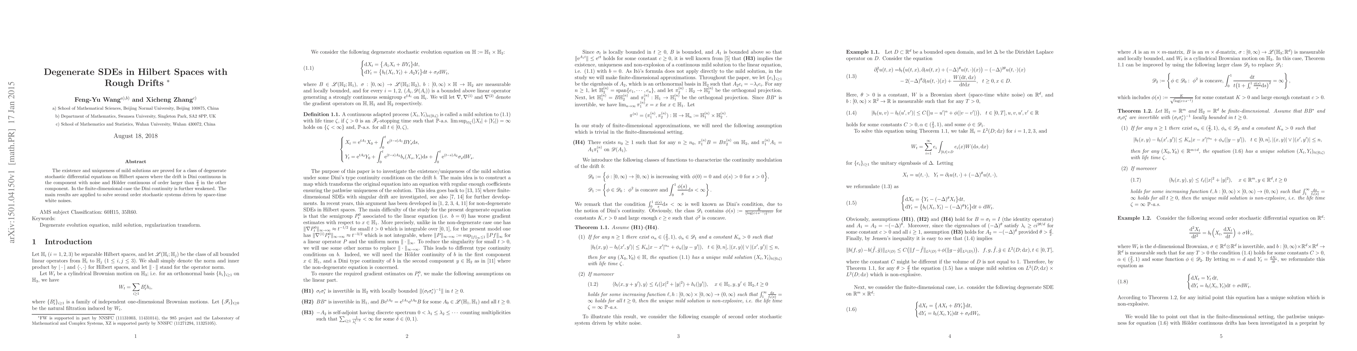 This research proves existence and uniqueness of solutions for degenerate stochastic differential equations (SDEs) in Hilbert spaces. The drift is Dini continuous in one component and H"older continuous in the other, with further relaxation in finite dimensions. The findings are applied to solve second-order SDEs driven by space-time white noises.