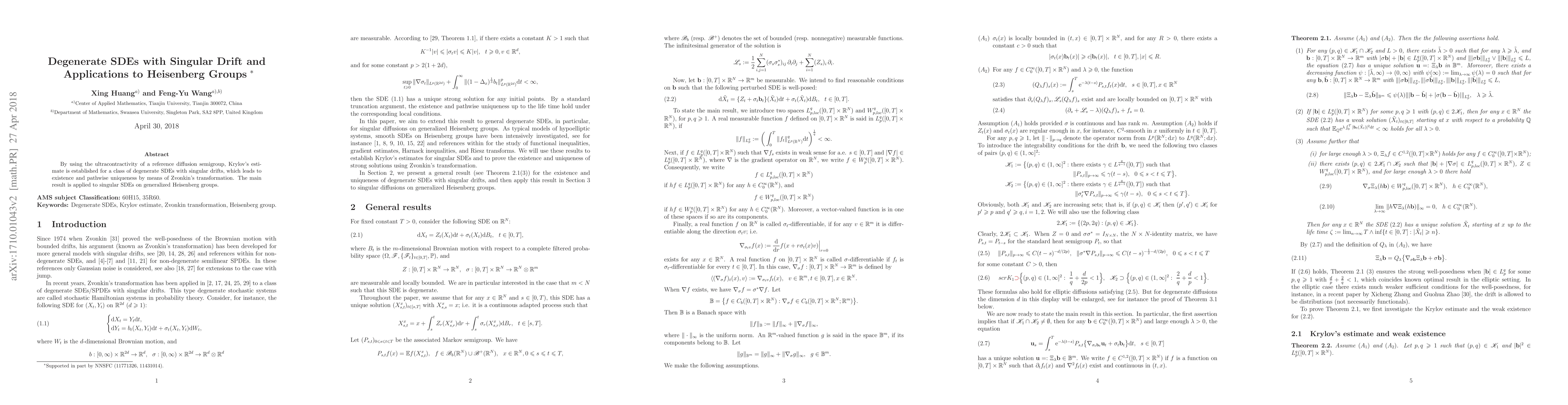 This paper establishes Krylov's estimate for degenerate SDEs with singular drifts using ultracontractivity, ensuring existence and pathwise uniqueness via Zvonkin's transformation. The results are then applied to singular SDEs on generalized Heisenberg groups.