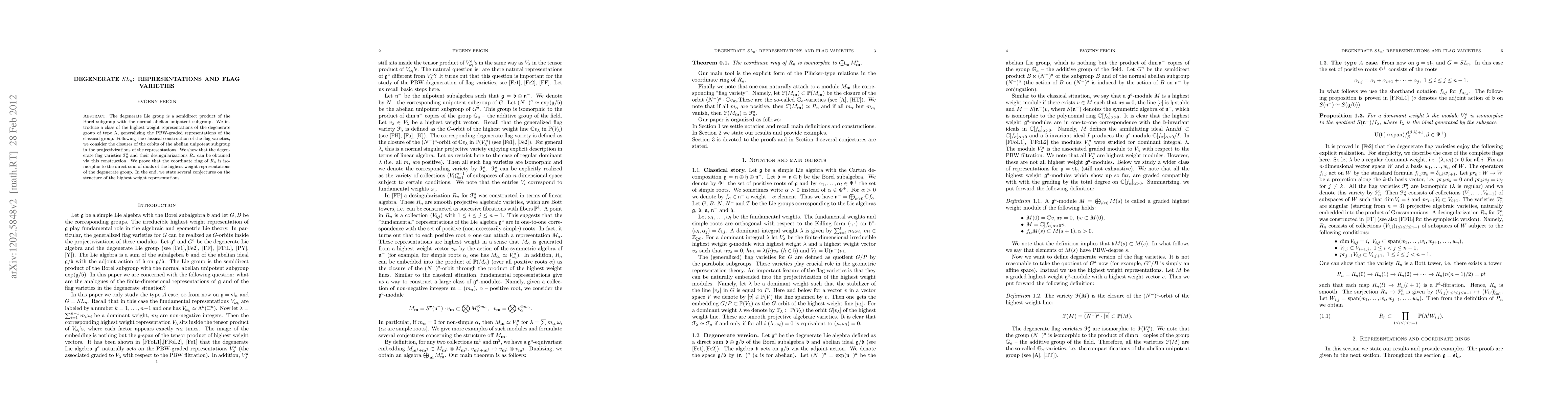 This paper explores highest weight representations of the degenerate Lie group $SL_n$, generalizing classical PBW-graded representations. It constructs degenerate flag varieties $\Fl^a_n$ and their desingularizations $R_n$ via closures of orbits of an abelian unipotent subgroup, proving that the coordinate ring of $R_n$ is isomorphic to the direct sum of duals of these representations.