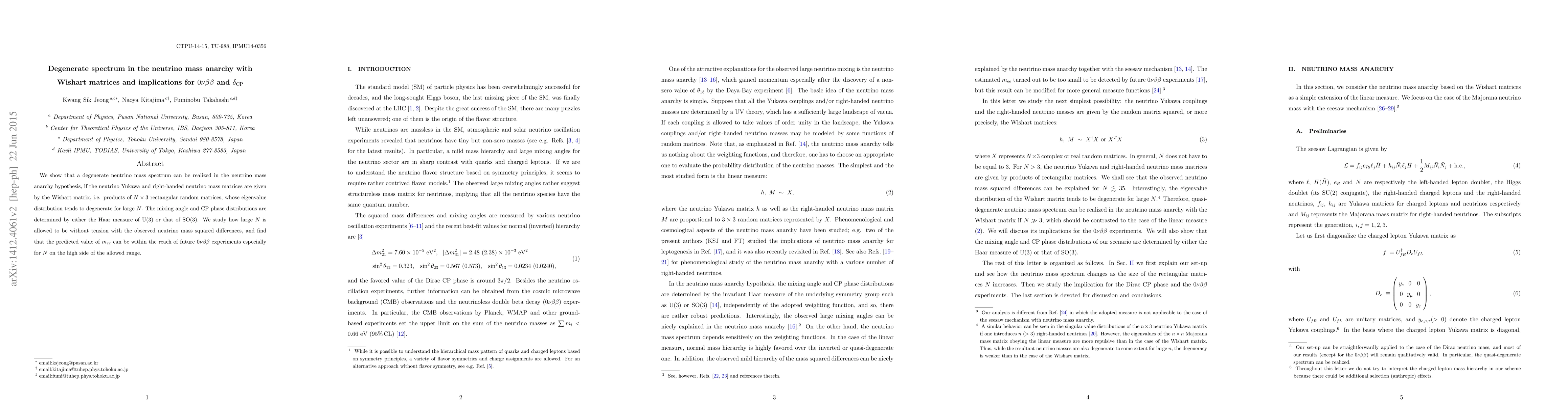 We show that a degenerate neutrino mass spectrum can be realized in the neutrino mass anarchy hypothesis, if the neutrino Yukawa and right-handed neutrino mass matrices are given by the Wishart matrix, i.e. products of $N \times 3$ rectangular random matrices, whose eigenvalue distribution tends to degenerate for large $N$. The mixing angle and CP phase distributions are determined by either the Haar measure of U(3) or that of SO(3). We study how large $N$ is allowed to be without tension with the observed neutrino mass squared differences, and find that the predicted value of $m_{ee}$ can be within the reach of future $0\nu\beta\beta$ experiments especially for $N$ on the high side of the allowed range.