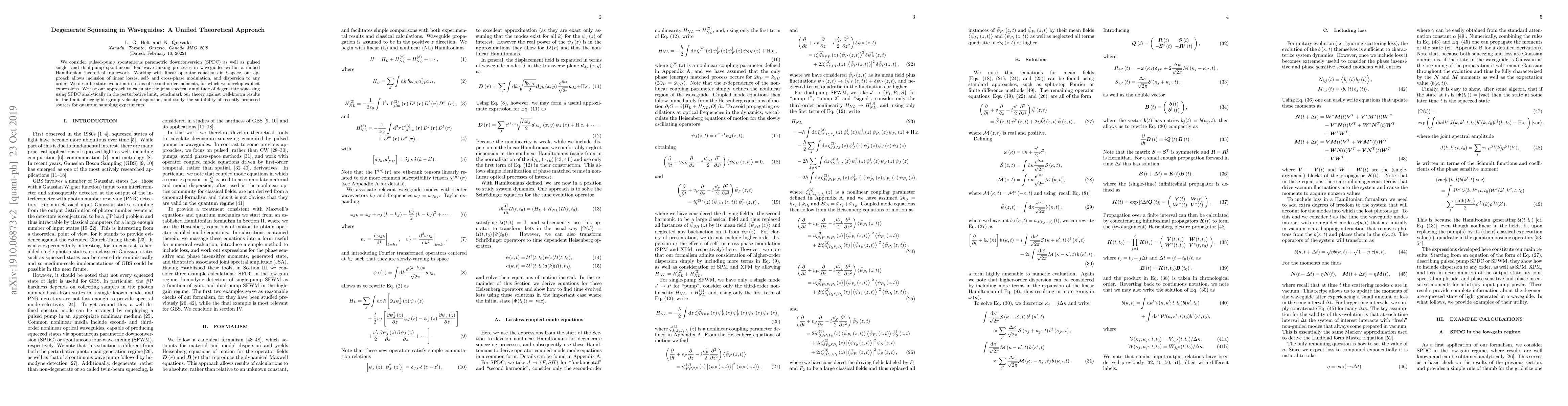 We consider pulsed-pump spontaneous parametric downconversion (SPDC) as well as pulsed single- and dual-pump spontaneous four-wave mixing processes in waveguides within a unified Hamiltonian theoretical framework. Working with linear operator equations in $k$-space, our approach allows inclusion of linear losses, self- and cross-phase modulation, and dispersion to any order. We describe state evolution in terms of second-order moments, for which we develop explicit expressions. We use our approach to calculate the joint spectral amplitude of degenerate squeezing using SPDC analytically in the perturbative limit, benchmark our theory against well-known results in the limit of negligible group velocity dispersion, and study the suitability of recently proposed sources for quantum sampling experiments.