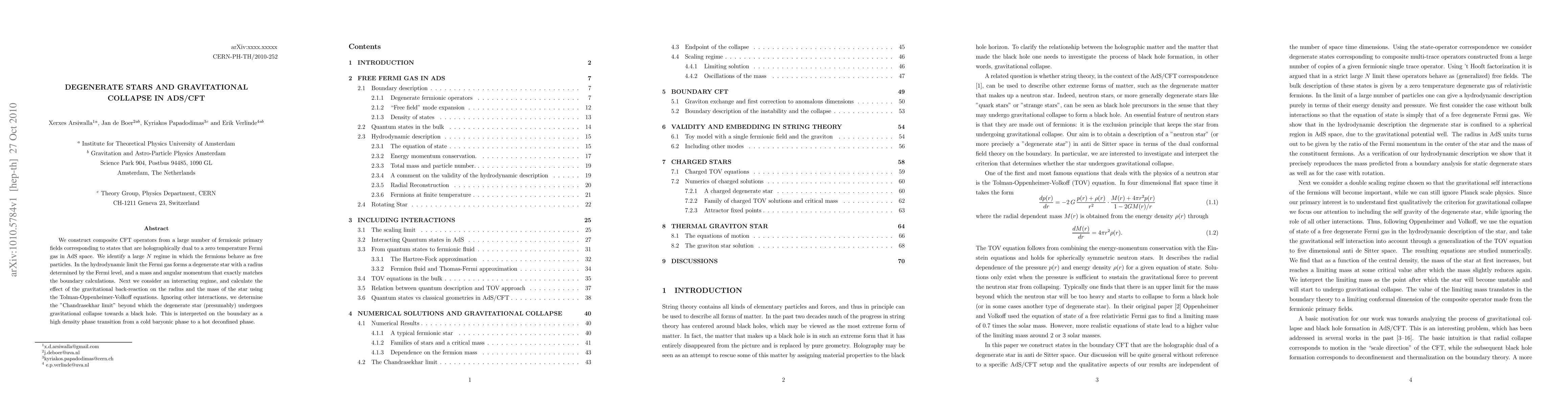 This paper constructs composite CFT operators from fermionic primary fields to model a zero-temperature Fermi gas in AdS space, identifying a large N regime where fermions behave freely. It examines the gravitational collapse of a degenerate star formed by this gas, determining the Chandrasekhar limit and interpreting the collapse as a phase transition from a cold baryonic phase to a hot deconfined phase on the boundary.