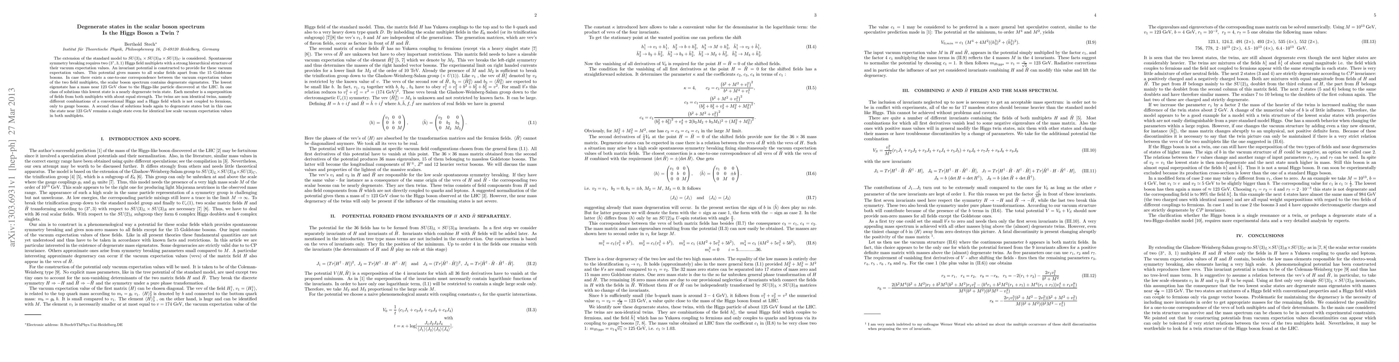 The extension of the standard model to $SU(3)_L\times SU(3)_R \times SU(3)_C$ is considered. Spontaneous symmetry breaking requires two $(3^*, 3, 1)$ Higgs field multiplets with a strong hierarchical structure of their vacuum expectation values. An invariant potential is constructed to provide for these vacuum expectation values. This potential gives masses to all scalar fields apart from the 15 Goldstone bosons. In case there exists a one-to-one correspondence between the vacuum expectation values of the two field multiplets, the scalar boson spectrum contains degenerate eigenstates. The lowest eigenstate has a mass near 123 GeV close to the Higgs-like particle discovered at the LHC. In one class of solutions this lowest state is a nearly degenerate twin state. Each member is a superposition of fields from both multiplets with about equal strength. The twins are non identical twins, namely different combinations of a conventional Higgs and a Higgs field which is not coupled to fermions, only to gauge bosons. A second class of solutions leads again to degenerate states but in this case the state near 123 GeV remains a single state even for identical low scale vacuum expectation values in both multiplets.