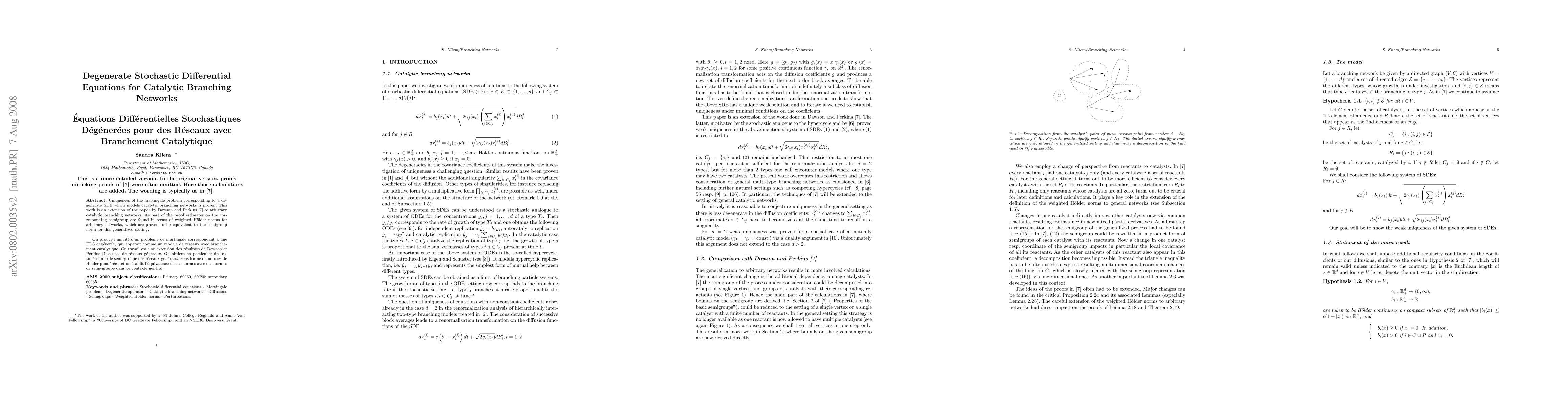 Uniqueness of the martingale problem corresponding to a degenerate SDE which models catalytic branching networks is proven. This work is an extension of a paper by Dawson and Perkins to arbitrary catalytic branching networks. As part of the proof estimates on the corresponding semigroup are found in terms of weighted Holder norms for arbitrary networks, which are proven to be equivalent to the semigroup norm for this generalized setting. ----- On prouve l'unicite d'un probleme de martingale correspondant a une EDS degeneree, qui apparait comme un modele de reseaux avec branchement catalytique. Ce travail est une extension des resultats de Dawson et Perkins au cas de reseaux generaux. On obtient en particulier des estimees pour le semi-groupe des reseaux generaux, sous forme de normes de Holder ponderees; et on etablit l'equivalence de ces normes avec des normes de semi-groupe dans ce contexte general.