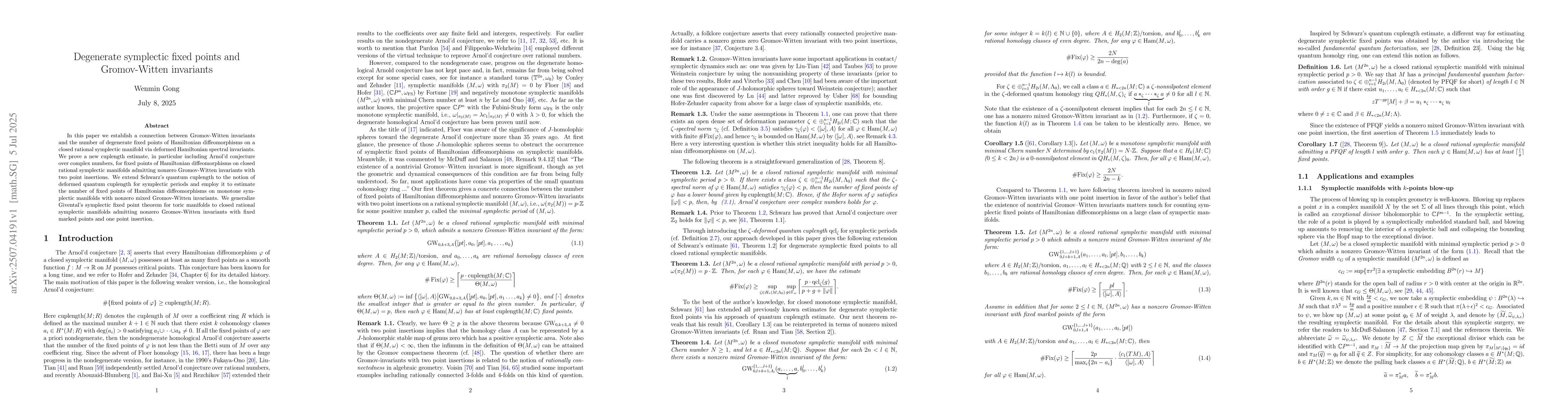 In this paper we establish a connection between Gromov-Witten invariants and the number of degenerate fixed points of Hamiltonian diffeomorphisms on a closed rational symplectic manifold via deformed Hamiltonian spectral invariants. We prove a new cuplength estimate, in particular including Arnol'd conjecture over complex numbers, for fixed points of Hamiltonian diffeomorphisms on closed rational symplectic manifolds admitting nonzero Gromov-Witten invariants with two point insertions. We extend Schwarz's quantum cuplength to the notion of deformed quantum cuplength for symplectic periods and employ it to estimate the number of fixed points of Hamiltonian diffeomorphisms on monotone symplectic manifolds with nonzero mixed Gromov-Witten invariants. We generalize Givental's symplectic fixed point theorem for toric manifolds to closed rational symplectic manifolds admitting nonzero Gromov-Witten invariants with fixed marked points and one point insertion.