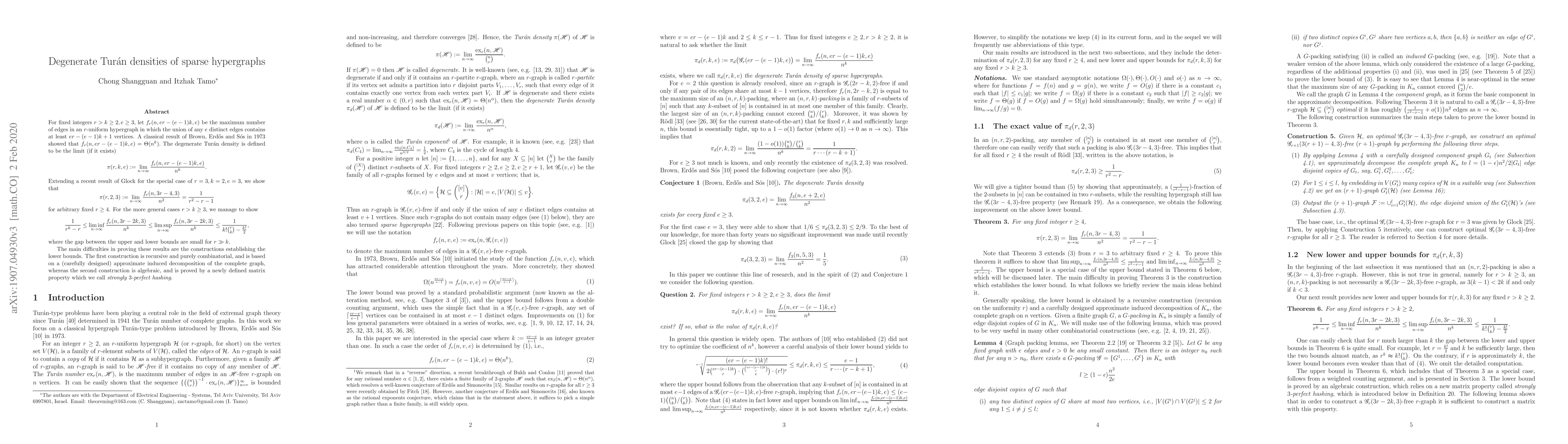 For fixed integers $r>k\ge 2,e\ge 3$, let $f_r(n,er-(e-1)k,e)$ be the maximum number of edges in an $r$-uniform hypergraph in which the union of any $e$ distinct edges contains at least $er-(e-1)k+1$ vertices. A classical result of Brown, Erd\H{o}s and S\'os in 1973 showed that $f_r(n,er-(e-1)k,e)=\Theta(n^k).$ The degenerate Tur\'an density is defined to be the limit (if it exists) $$\pi(r,k,e):=\lim_{n\rightarrow\infty}\frac{f_r(n,er-(e-1)k,e)}{n^k}.$$ Extending a recent result of Glock for the special case of $r=3,k=2,e=3$, we show that $$\pi(r,2,3):=\lim_{n\rightarrow\infty}\frac{f_r(n,3r-4,3)}{n^2}=\frac{1}{r^2-r-1}$$ for arbitrary fixed $r\ge 4$. For the more general cases $r>k\ge 3$, we show that $$\frac{1}{r^k-r}\le\liminf_{n\rightarrow\infty}\frac{f_r(n,3r-2k,3)}{n^k}\le\limsup_{n\rightarrow\infty}\frac{f_r(n,3r-2k,3)}{n^k}\le \frac{1}{k!\binom{r}{k}-\frac{k!}{2}}.$$ The main difficulties in proving these results are the constructions establishing the lower bounds. The first construction is recursive and purely combinatorial, and is based on a (carefully designed) approximate induced decomposition of the complete graph, whereas the second construction is algebraic, and is proved by a newly defined matrix property which we call {\it strongly 3-perfect hashing}.