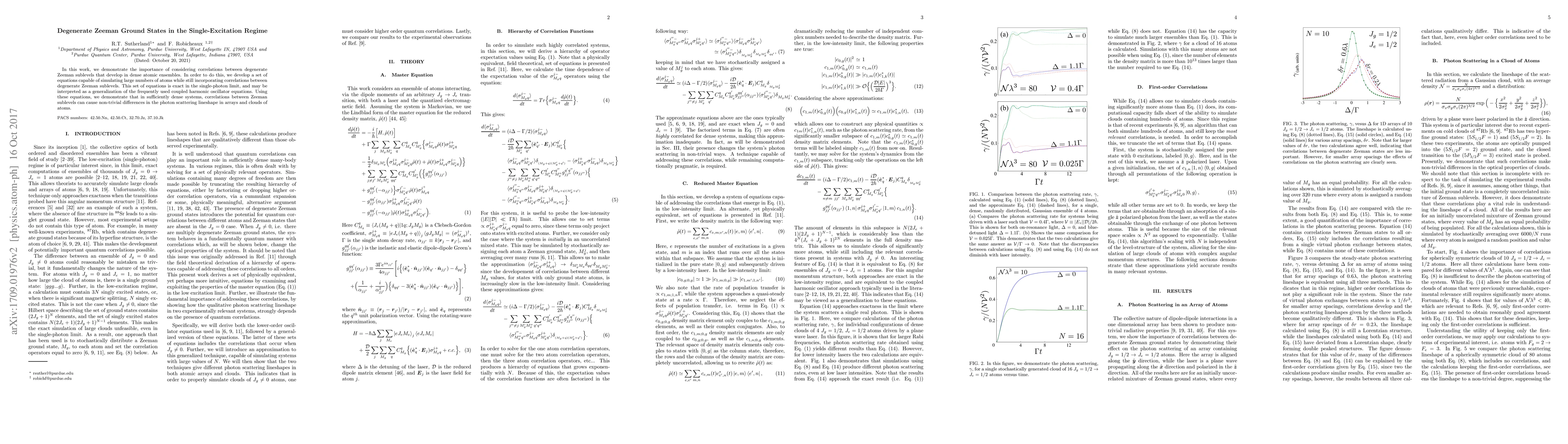 This research introduces a new set of equations to simulate dense atomic ensembles, accounting for correlations between degenerate Zeeman sublevels. These equations, exact in the single-photon limit, reveal that such correlations can significantly alter photon scattering lineshapes in atom arrays and clouds.