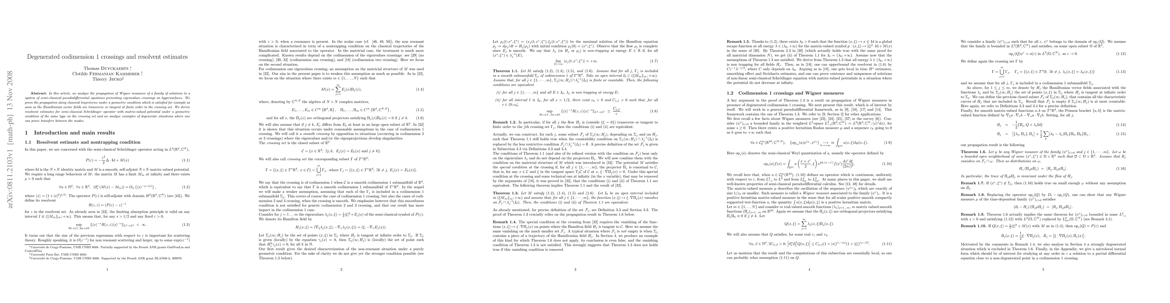 This paper analyzes how Wigner measures propagate along classical trajectories in systems with eigenvalue crossings on hypersurfaces, providing resolvent estimates under specific geometric conditions.