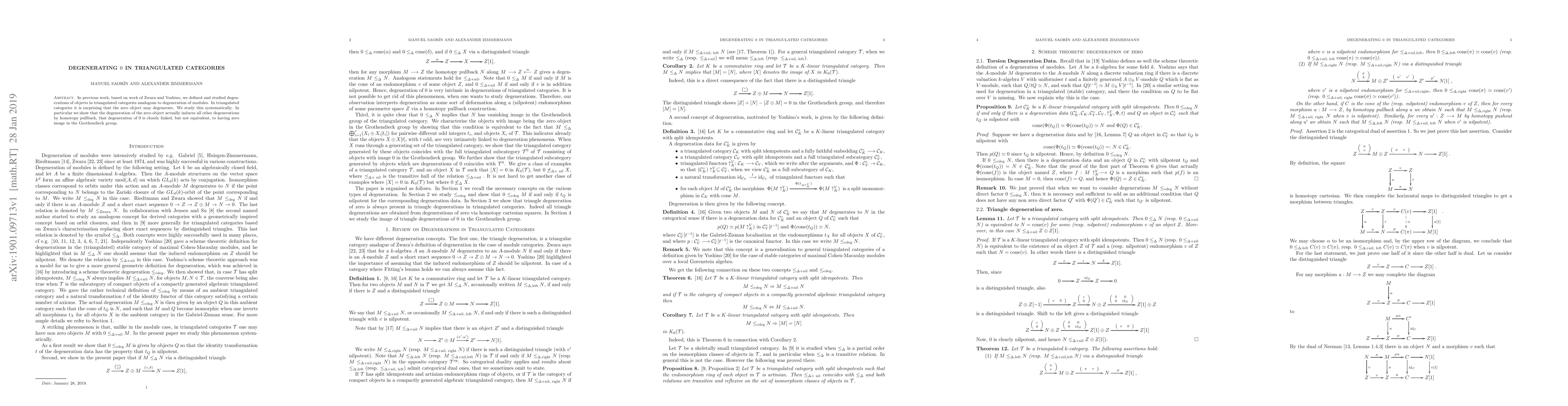 In previous work, based on work of Zwara and Yoshino, we defined and studied degenerations of objects in triangulated categories analogous to degeneration of modules. In triangulated categories it is surprising that the zero object may degenerate. We study this systematically. In particular we show that the degeneration of the zero object actually induces all other degenerations by homotopy pullback, that degeneration of $0$ is closely linked, but not equivalent, to having zero image in the Grothendieck group.