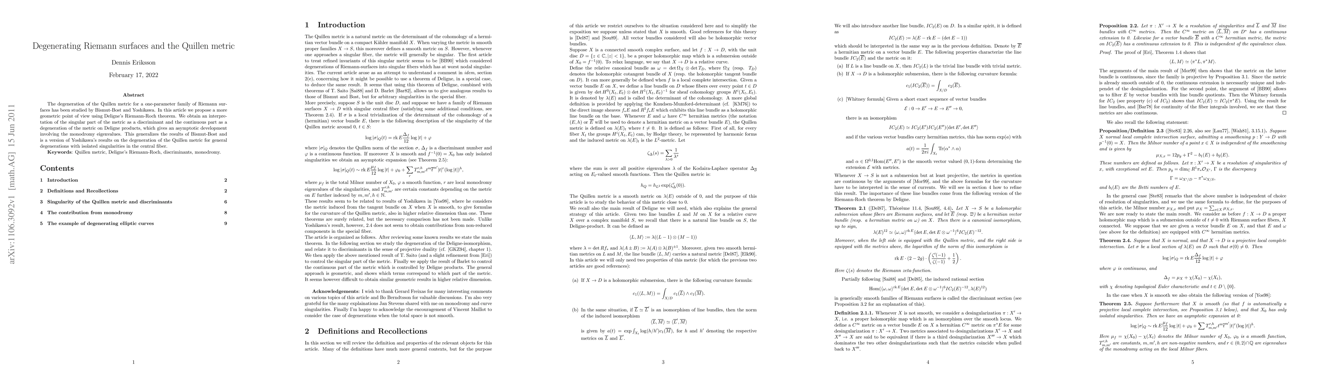 This paper proposes a geometric interpretation of the degeneration of the Quillen metric for a one-parameter family of Riemann surfaces using Deligne's Riemann-Roch theorem, interpreting the singular part as a discriminant and the continuous part as a degeneration of metrics on Deligne products. This generalizes previous results by Bismut-Bost and Yoshikawa.