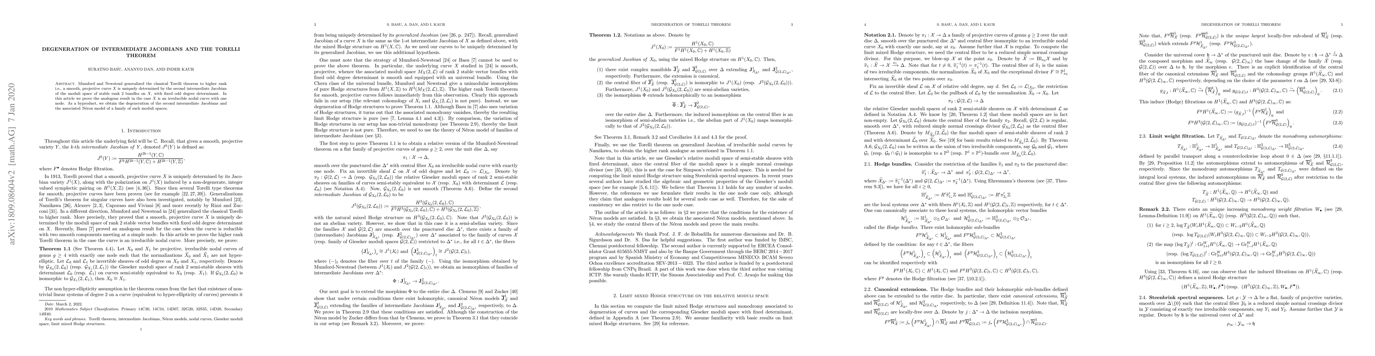 This paper extends the Torelli theorem to irreducible nodal curves with one node by showing that such curves are uniquely determined by their second intermediate Jacobians. Additionally, it explores the degeneration of these intermediate Jacobians and their associated Néron models.