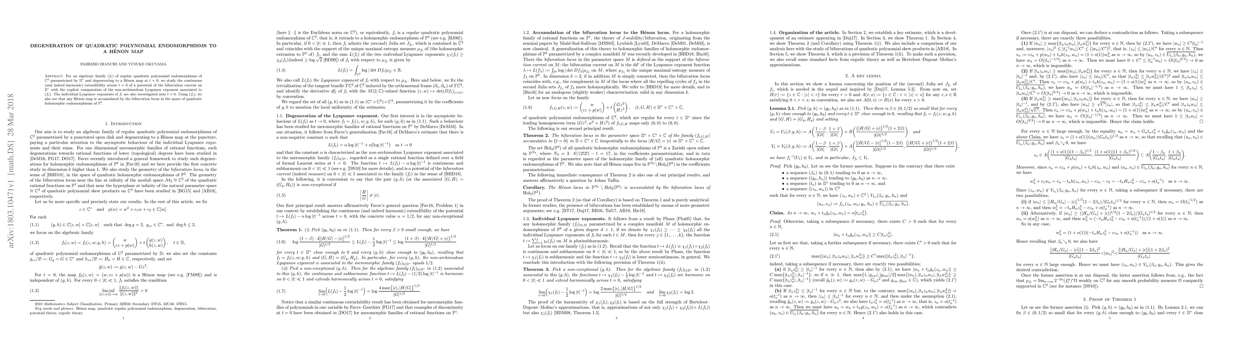 For an algebraic family $(f_t)$ of regular quadratic polynomial endomorphisms of $\mathbb{C}^2$ parametrized by $\mathbb{D}^*$ and degenerating to a H\'enon map at $t=0$, we study the continuous (and indeed harmonic) extendibility across $t=0$ of a potential of the bifurcation current on $\mathbb{D}^*$ with the explicit computation of the non-archimedean Lyapunov exponent associated to $(f_t)$. The individual Lyapunov exponents of $f_t$ are also investigated near $t=0$. Using $(f_t)$, we also see that any H\'enon map is accumulated by the bifurcation locus in the space of quadratic holomorphic endomorphisms of $\mathbb {P}^2$.