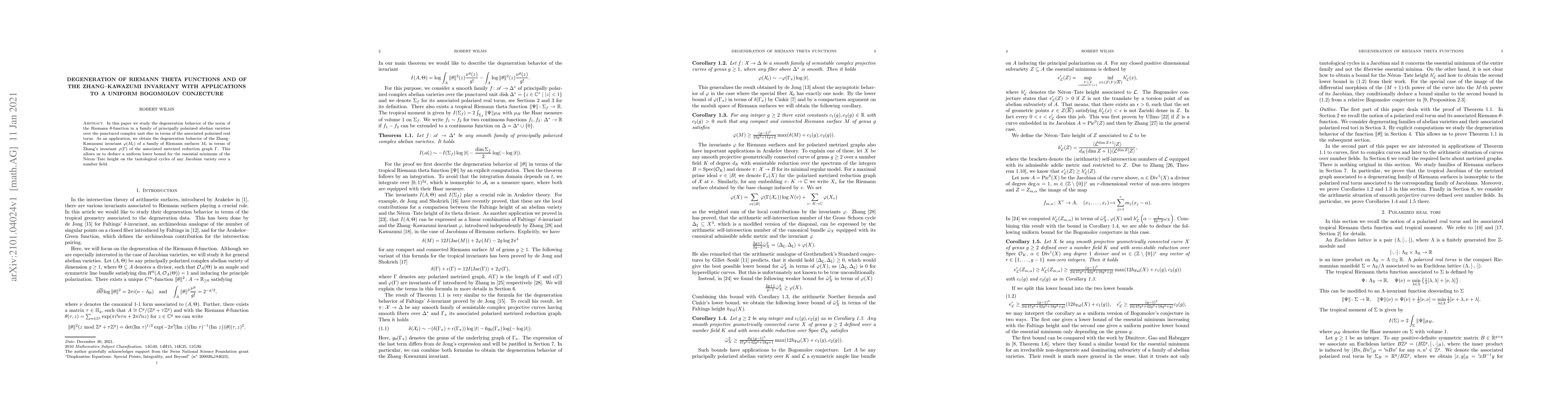 This paper investigates the degeneration of Riemann theta functions and the Zhang-Kawazumi invariant in families of principally polarized abelian varieties and Riemann surfaces. It derives a uniform Bogomolov conjecture by establishing a lower bound for the essential minimum of the Néron-Tate height on Jacobian varieties.
