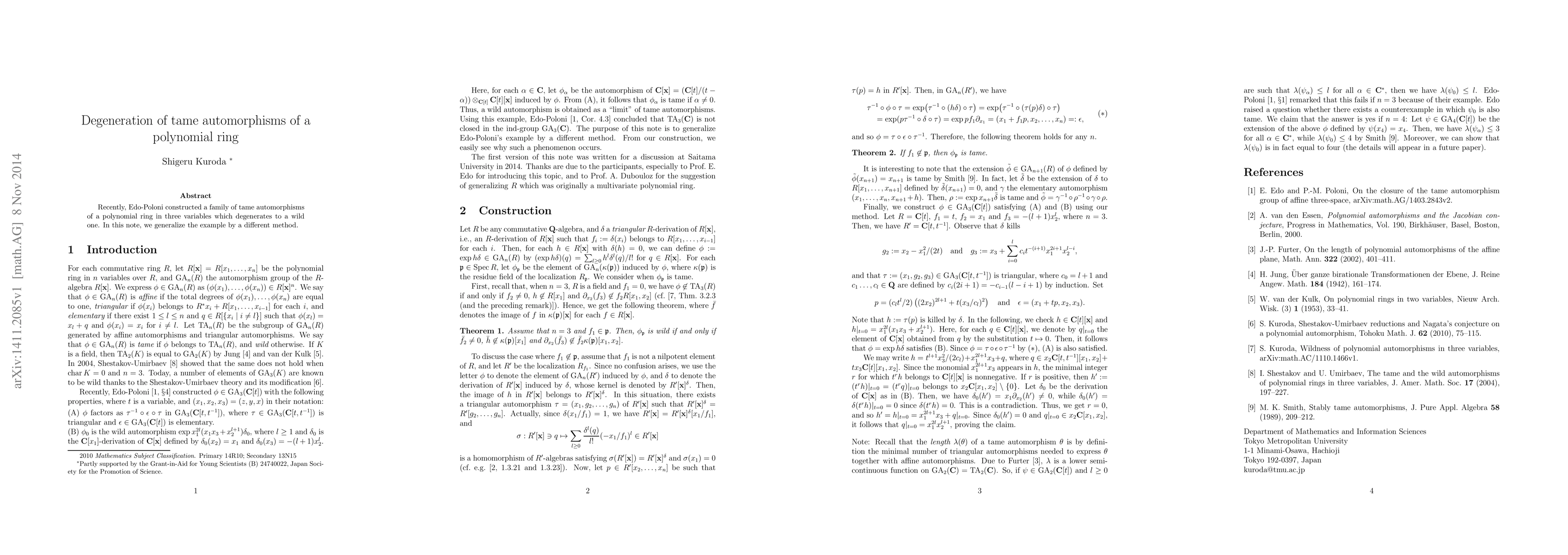 Summary: This paper generalizes Edo-Poloni's construction of a family of tame automorphisms in a polynomial ring that degenerates to a wild automorphism, providing an alternative method for this degeneration phenomenon.