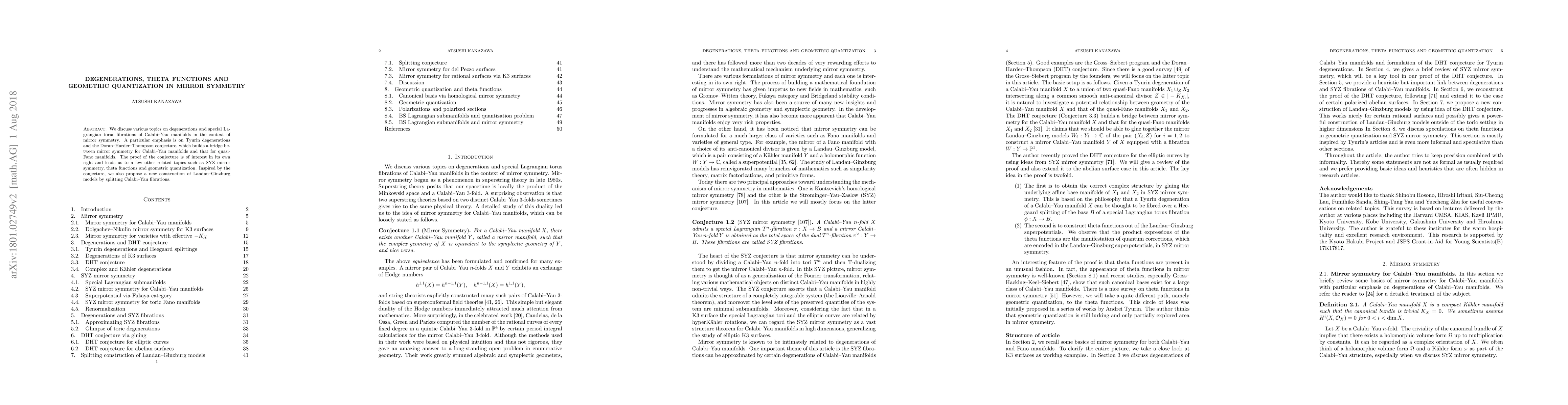 This paper explores degenerations and special Lagrangian torus fibrations of Calabi-Yau manifolds within the framework of mirror symmetry, focusing on Tyurin degenerations and the Doran-Harder-Thompson conjecture. The proof of this conjecture links mirror symmetry for Calabi-Yau and quasi-Fano manifolds, and it leads to discussions on SYZ mirror symmetry, theta functions, and geometric quantization, along with a new construction of Landau-Ginzburg models.