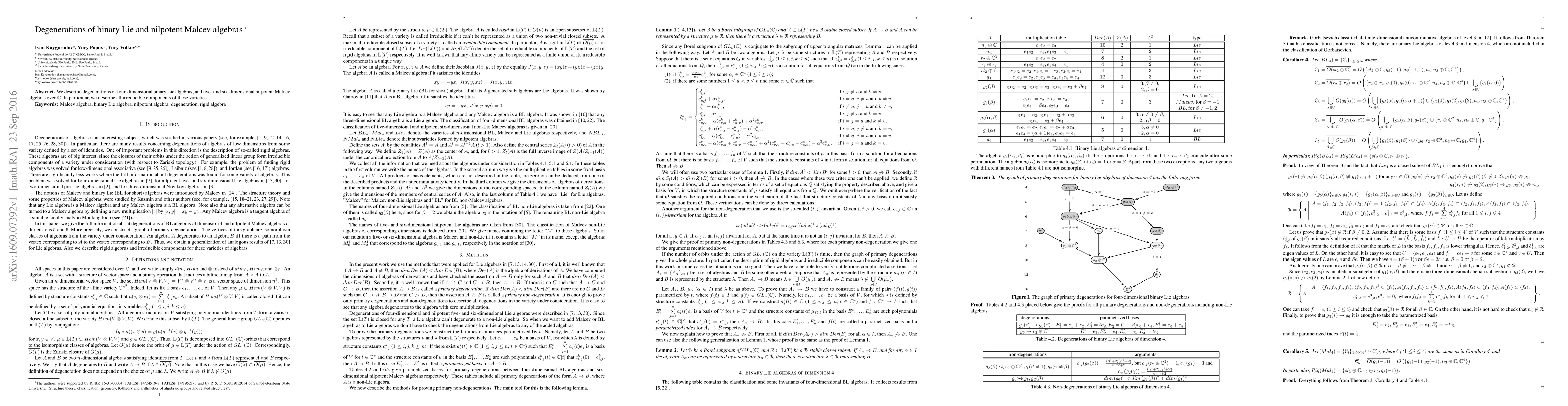 We describe degenerations of four-dimensional binary Lie algebras, and five- and six-dimensional nilpotent Malcev algebras over \mathbb{C}. In particular, we describe all irreducible components of these varieties.