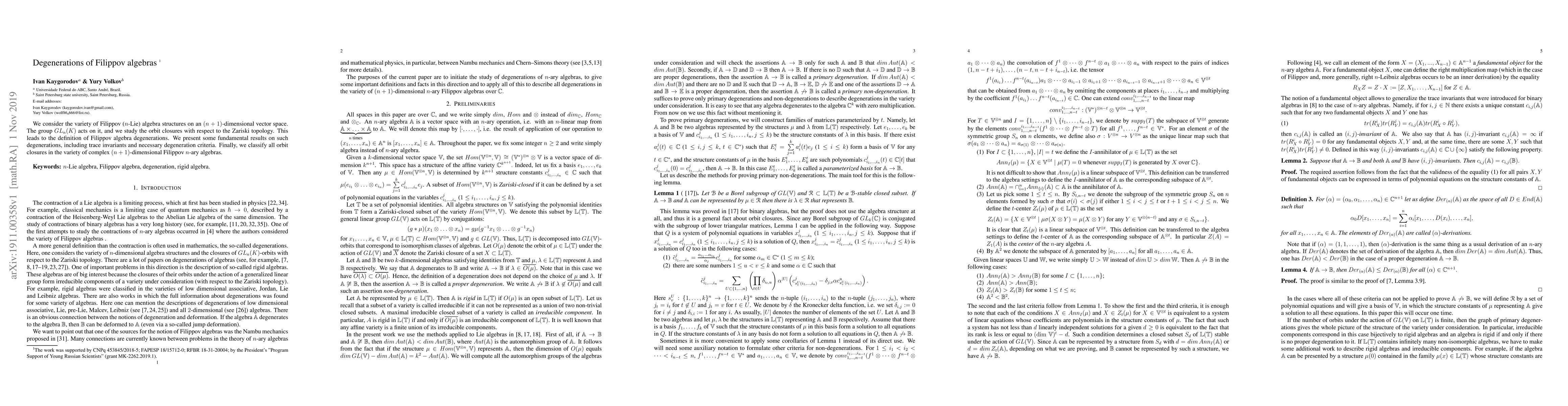 This paper studies the variety of Filippov ($n$-Lie) algebra structures on an $(n+1)$-dimensional vector space, focusing on orbit closures under the $GL_n(K)$ action. It classifies all orbit closures and presents fundamental results on degenerations, including trace invariants and necessary criteria.
