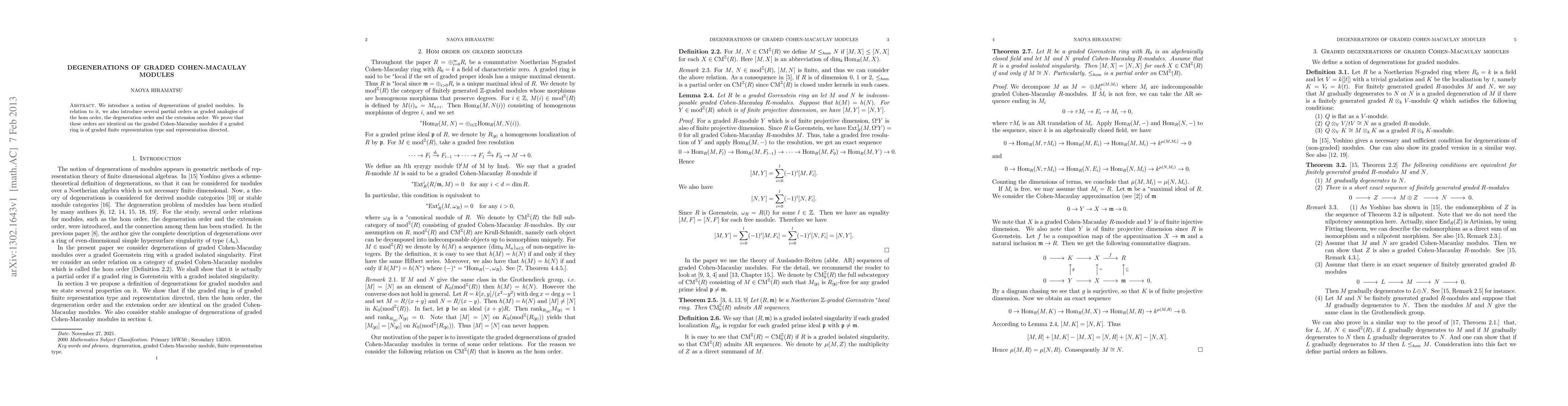 The paper introduces a notion of degenerations for graded modules and establishes several partial orders as graded analogies of the hom order, degeneration order, and extension order. It proves their identity on graded Cohen-Macaulay modules under specific conditions.