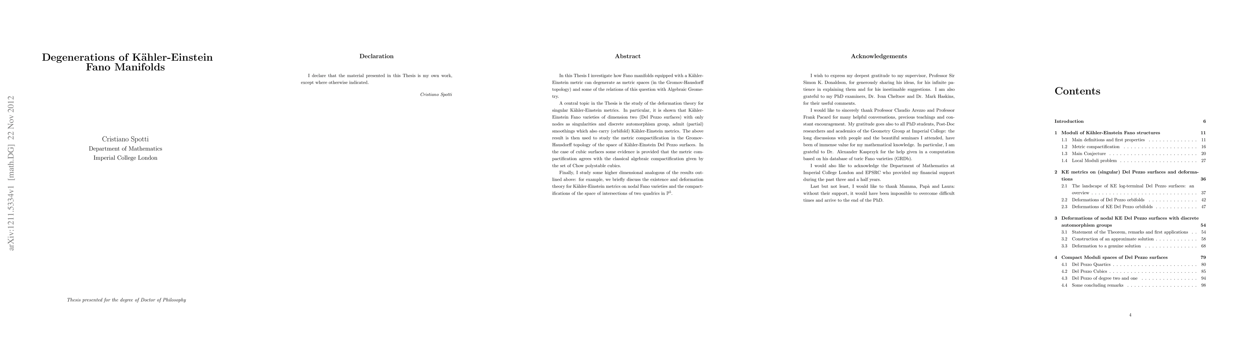 This paper explores the degeneration processes of Kähler-Einstein Fano manifolds in metric spaces and examines their connections to algebraic geometry, focusing on moduli spaces and their compactifications. The study highlights how these geometric structures can transform under the Gromov-Hausdorff topology.