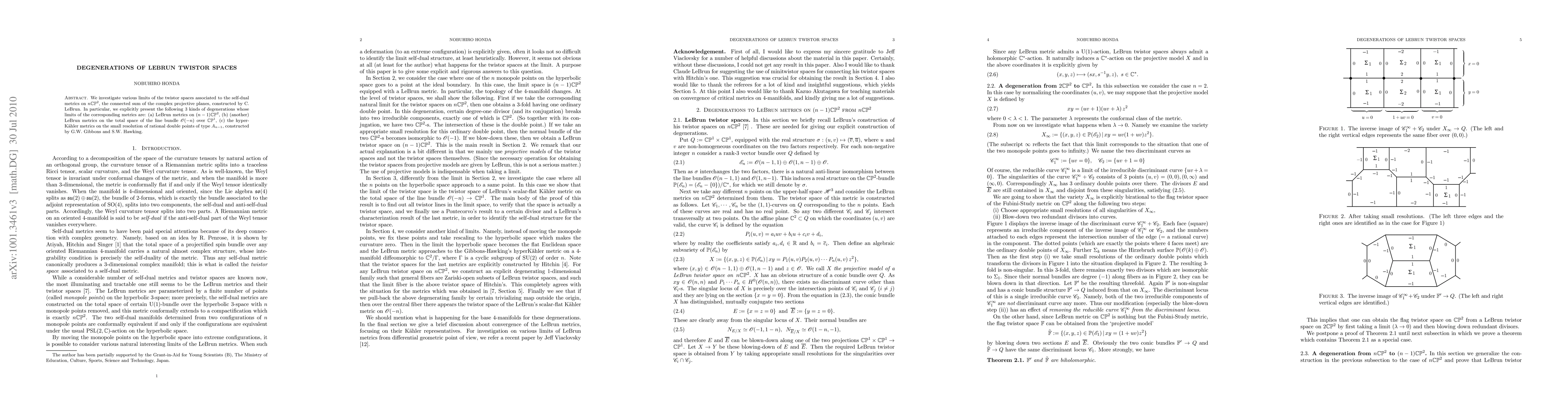 This paper explores the degenerations of LeBrun twistor spaces linked to self-dual metrics on n CP^2, identifying three specific types of limits: (a) LeBrun metrics on (n-1) CP^2, (b) another set of LeBrun metrics on O(-n) line bundle over CP^1, and (c) hyper-Kähler metrics on the small resolution of rational double points of type A_{n-1}.