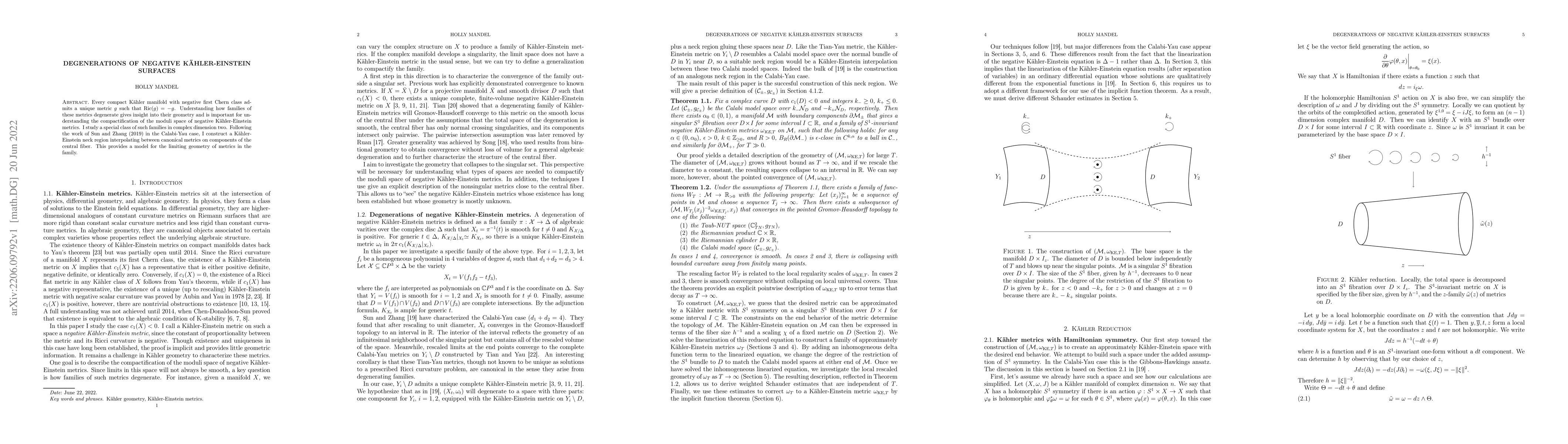 This paper explores the degenerations of negative Kähler-Einstein surfaces in complex dimension two, focusing on the unique metrics where the Ricci curvature equals the negative of the metric itself. It constructs a Kähler-Einstein neck region to model the limiting geometry of these metrics, providing insights into the compactification of the moduli space of such metrics.