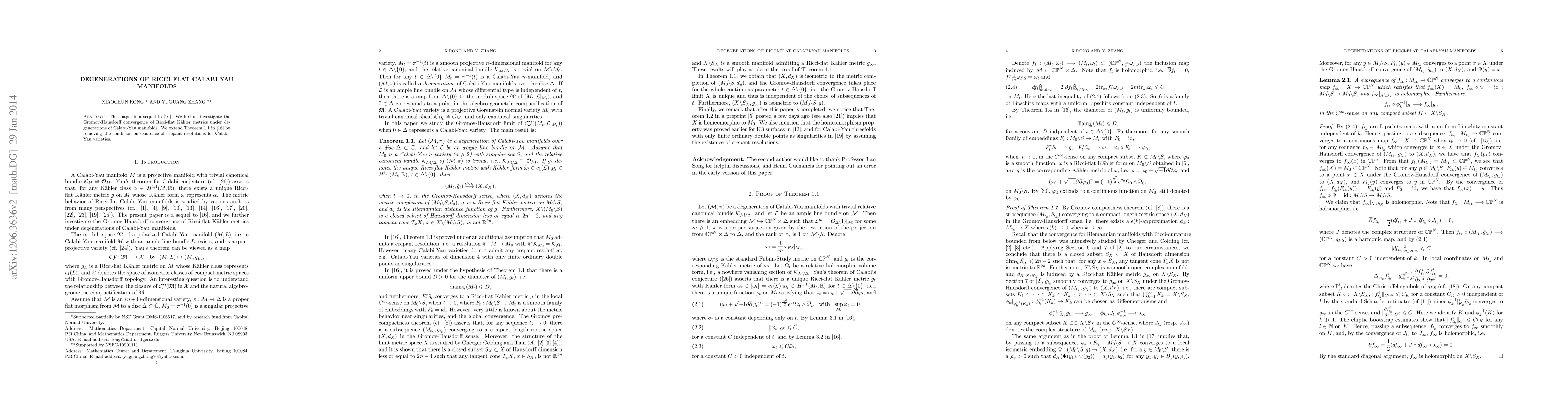 This paper extends previous work on Ricci-flat Kähler metrics, exploring their Gromov-Hausdorff convergence under Calabi-Yau manifold degenerations, and relaxes the requirement for crepant resolutions.