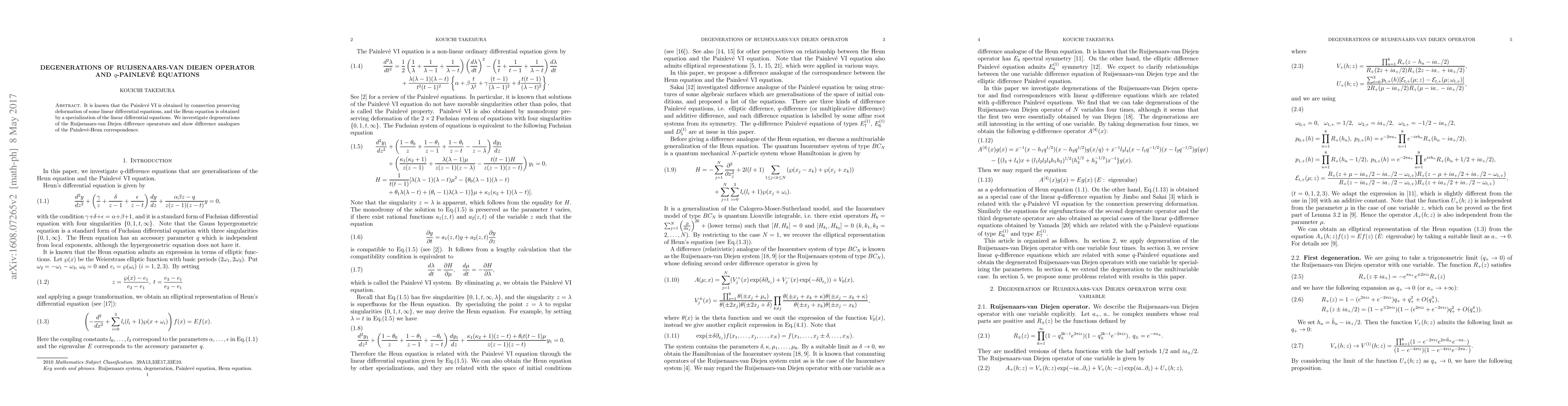It is known that the Painleve VI is obtained by connection preserving deformation of some linear differential equations, and the Heun equation is obtained by a specialization of the linear differential equations. We inverstigate degenerations of the Ruijsenaars-van Diejen difference opearators and show difference analogues of the Painleve-Heun correspondence.