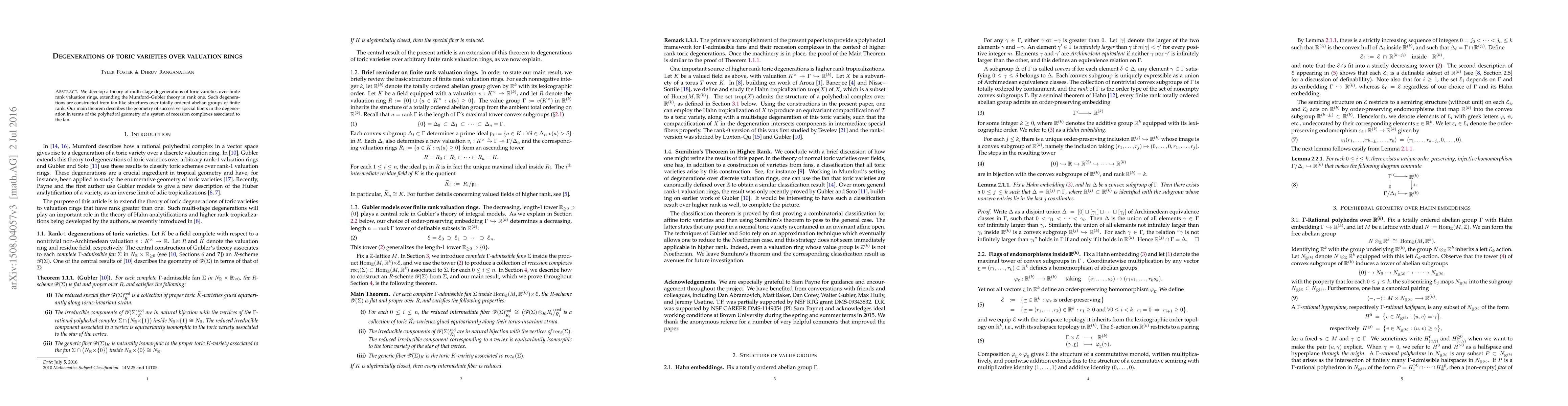 This paper extends the Mumford-Gubler theory to multi-stage degenerations of toric varieties over finite rank valuation rings, employing fan-like structures over totally ordered abelian groups. The main result links the geometry of special fibers in these degenerations to the polyhedral geometry of associated recession complexes.