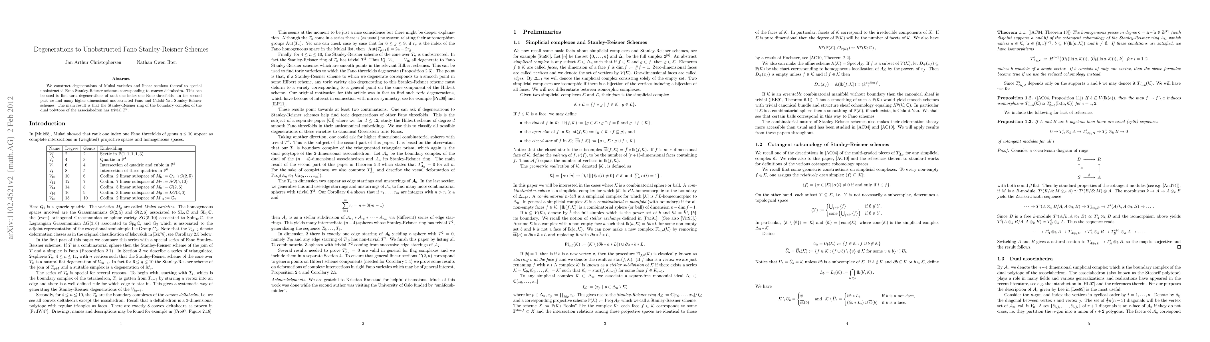 This paper constructs degenerations of Mukai varieties to special unobstructed Fano Stanley-Reisner schemes, specifically convex deltahedra, and finds toric degenerations of rank one index one Fano threefolds. It also identifies higher dimensional unobstructed Fano and Calabi-Yau Stanley-Reisner schemes, concluding that the Stanley-Reisner ring of the boundary complex of the dual polytope of the associahedron has trivial $T^2$.