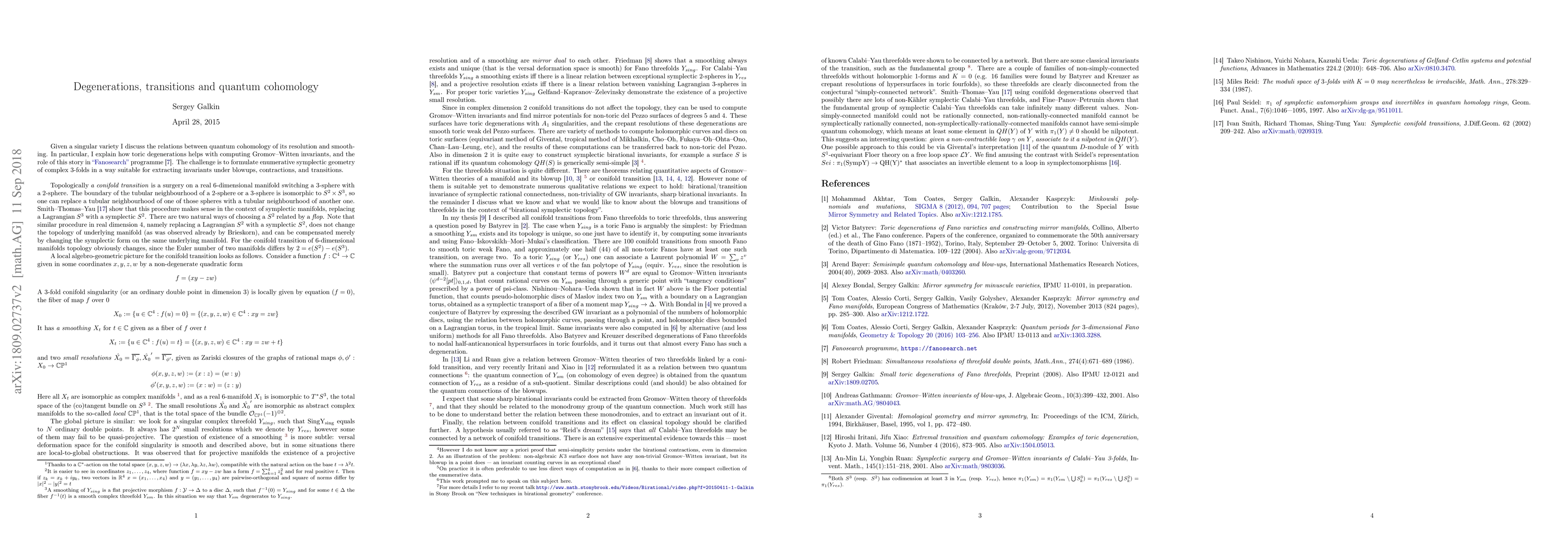 Given a singular variety I discuss the relations between quantum cohomology of its resolution and smoothing. In particular, I explain how toric degenerations helps with computing Gromov--Witten invariants, and the role of this story in Fanosearch programme. The challenge is to formulate enumerative symplectic geometry of complex $3$-folds in a way suitable for extracting invariants under blowups, contractions, and transitions.