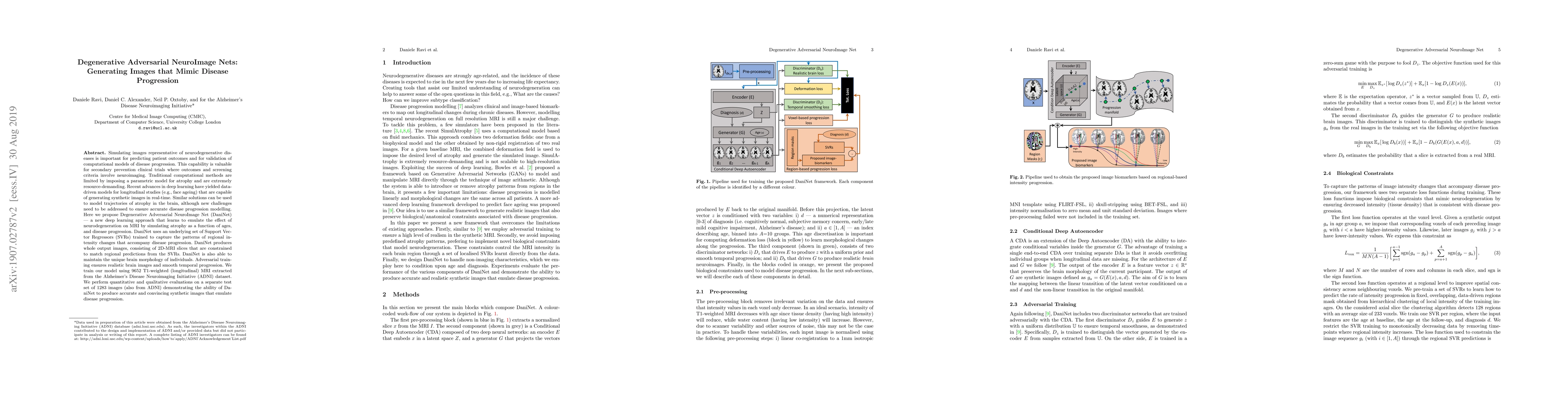 This paper proposes DaniNet, a deep learning model that uses adversarial training and Support Vector Regressors to generate synthetic MRI images mimicking neurodegenerative disease progression. The model is trained on longitudinal Alzheimer's Disease Neuroimaging Initiative data and demonstrates the ability to produce realistic, age-specific brain images that accurately represent disease progression.