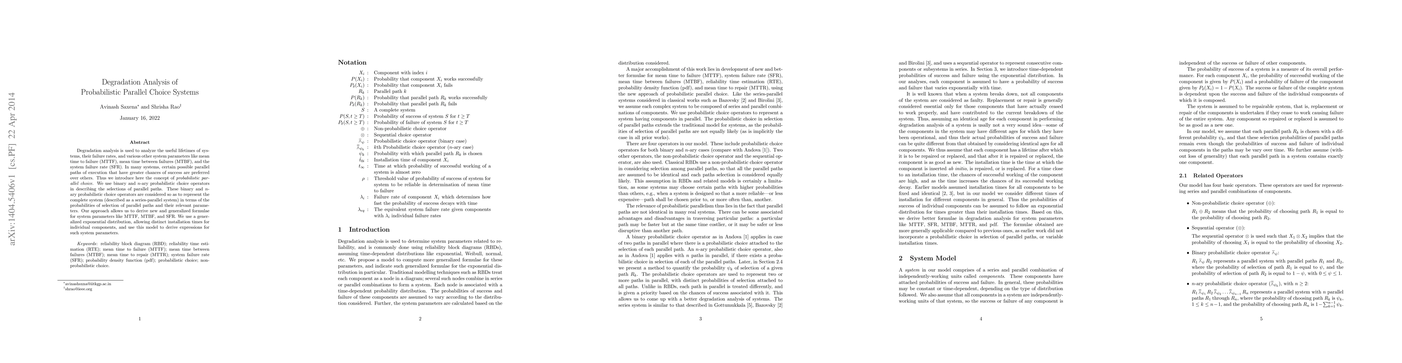 Degradation analysis is used to analyze the useful lifetimes of systems, their failure rates, and various other system parameters like mean time to failure (MTTF), mean time between failures (MTBF), and the system failure rate (SFR). In many systems, certain possible parallel paths of execution that have greater chances of success are preferred over others. Thus we introduce here the concept of probabilistic parallel choice. We use binary and $n$-ary probabilistic choice operators in describing the selections of parallel paths. These binary and $n$-ary probabilistic choice operators are considered so as to represent the complete system (described as a series-parallel system) in terms of the probabilities of selection of parallel paths and their relevant parameters. Our approach allows us to derive new and generalized formulae for system parameters like MTTF, MTBF, and SFR. We use a generalized exponential distribution, allowing distinct installation times for individual components, and use this model to derive expressions for such system parameters.