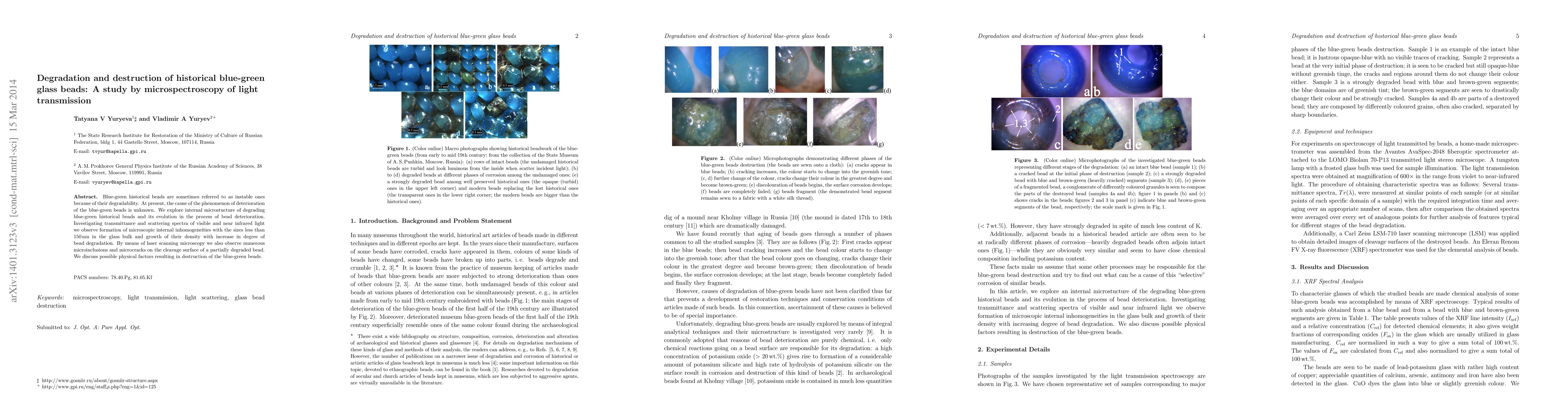Blue-green historical beads are sometimes referred to as instable ones because of their degradability. At present, the cause of the phenomenon of deterioration of the blue-green beads is unknown. We explore internal microstucture of degrading blue-green historical beads and its evolution in the process of bead deterioration. Investigating transmittance and scattering spectra of visible and near infrared light we observe formation of microscopic internal inhomogeneities with the sizes less than 150 nm in the glass bulk and growth of their density with increase in degree of bead degradation. By means of laser scanning microscopy we also observe numerous microinclusions and microcracks on the cleavage surface of a partially degraded bead. We discuss possible physical factors resulting in destruction of the blue-green beads.