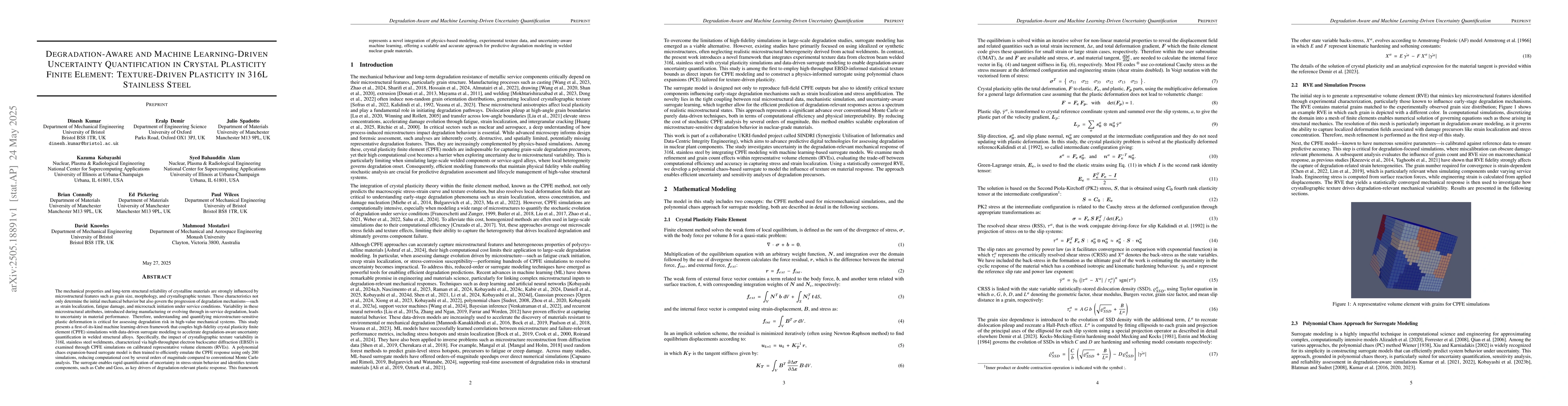 The research employs a machine learning-driven framework that integrates high-fidelity crystal plasticity finite element (CPFE) simulations with data-driven surrogate modeling to assess degradation risk in welded structural alloys. It focuses on texture variability in 316L stainless steel weldments, using calibrated representative volume elements (RVEs) and high-throughput electron backscatter diffraction (EBSD) characterization.
