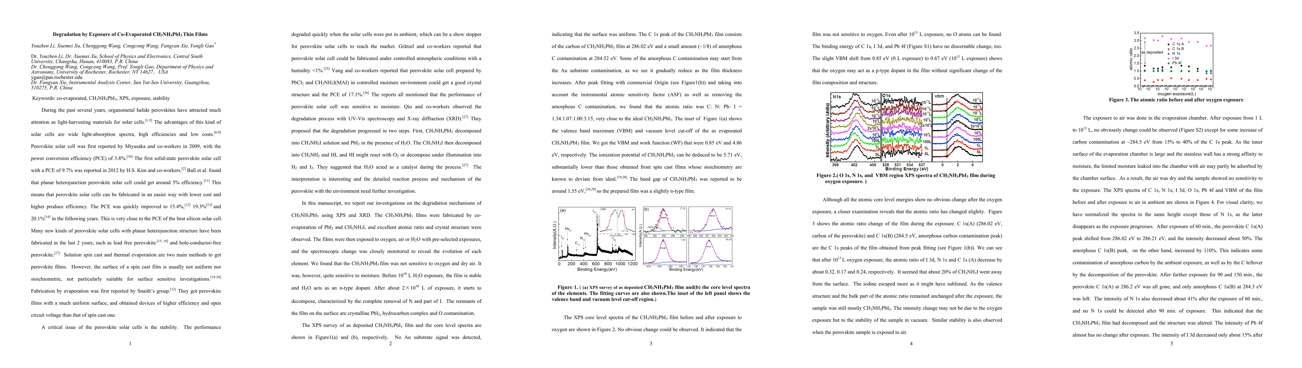 This study investigates the degradation of co-evaporated CH3NH3PbI3 thin films under various environmental exposures using XPS and XRD. The films show no sensitivity to oxygen or dry air, but degrade above a threshold exposure to H2O, resulting in the formation of PbI2, amorphous C, and O contamination.