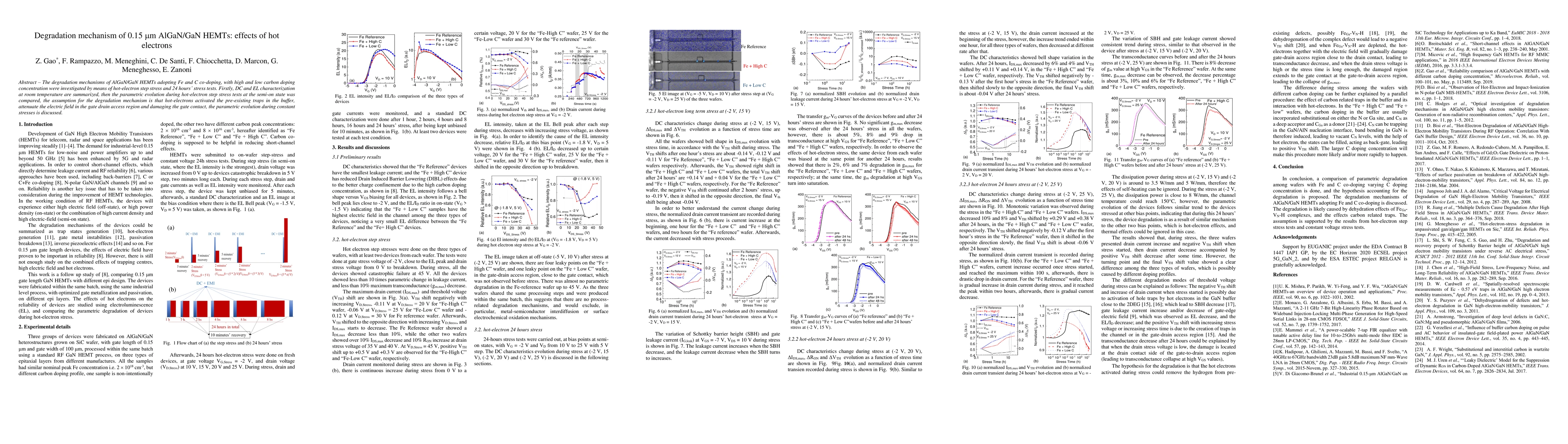 The degradation mechanisms of AlGaN/GaN HEMTs adopting Fe and C co-doping, with high and low carbon doping concentration were investigated by means of hot-electron step stress and 24 hours stress tests. Firstly, DC and EL characterization at room temperature are summarized, then the parametric evolution during hot-electron step stress tests at the semi-on state was compared, the assumption for the degradation mechanism is that hot-electrons activated the pre-existing traps in the buffer, attenuate the electric field in the gate drain access region and damaging the gate contact, the parametric evolution during constant stresses is discussed.