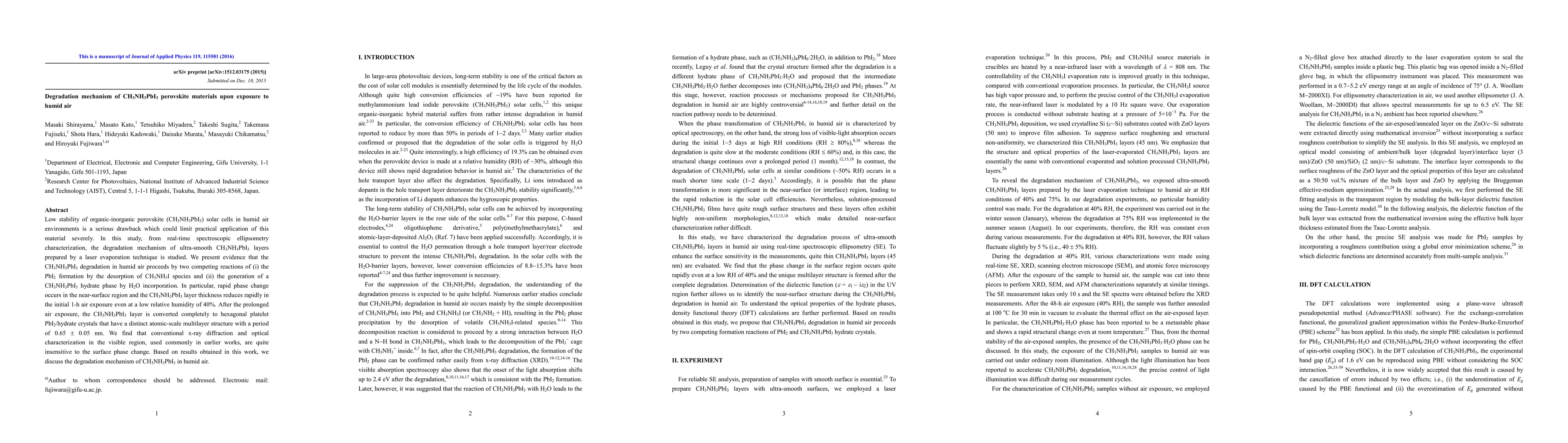 This study investigates the degradation mechanism of CH3NH3PbI3 perovskite solar cells in humid air, revealing that it proceeds via two main reactions: PbI2 formation from CH3NH3I desorption and the formation of a CH3NH3PbI3 hydrate phase through H2O incorporation, leading to rapid near-surface phase changes and significant layer thickness reduction within the first hour of exposure.