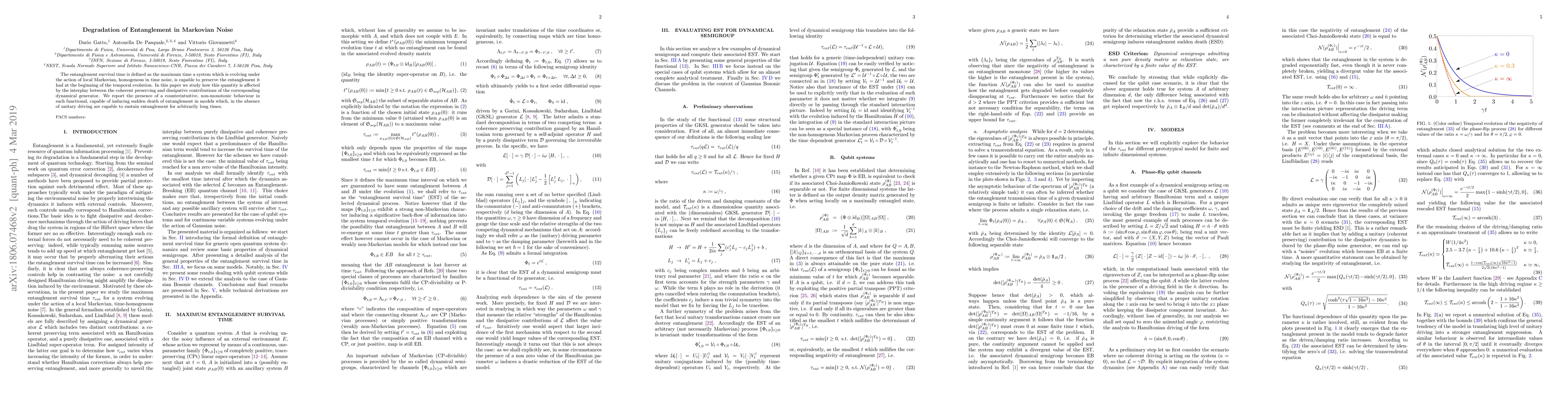 This paper investigates the entanglement survival time under local Markovian noise, revealing a non-monotonic behavior that can lead to sudden death of entanglement, despite the absence of unitary driving that would otherwise sustain entanglement indefinitely. The study highlights the complex interplay between coherent and dissipative noise components.