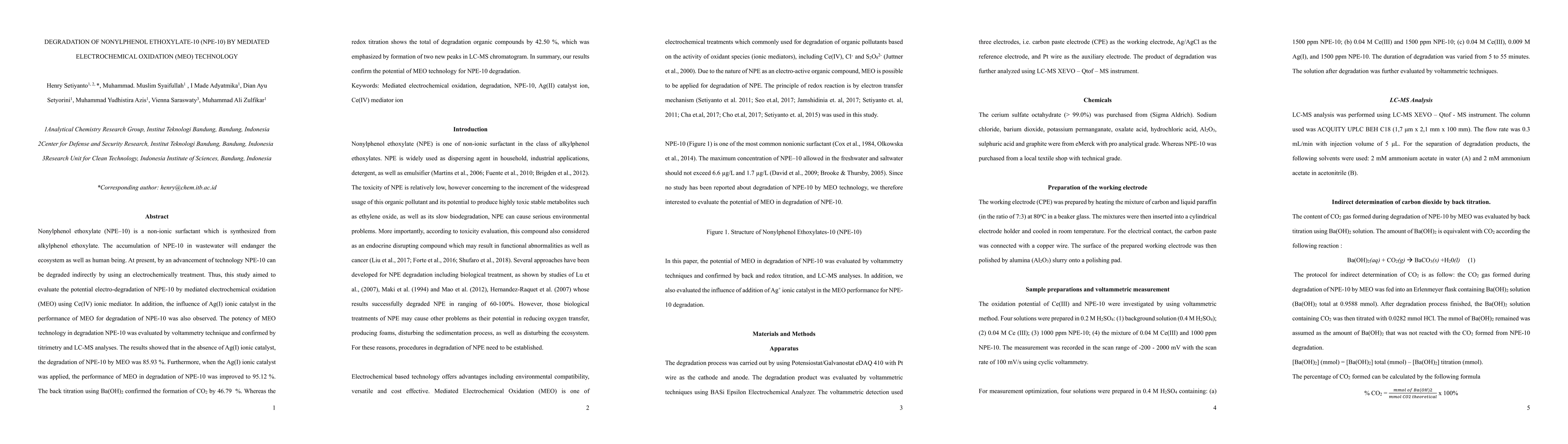 Nonylphenol ethoxylate (NPE 10) is a non ionic surfactant which is synthesized from alkylphenol ethoxylate. The accumulation of NPE-10 in wastewater will endanger the ecosystem as well as human being. At present, by an advancement of technology NPE 10 can be degraded indirectly by using an electrochemically treatment. Thus, this study aimed to evaluate the potential electrodegradation of NPE 10 by mediated electrochemical oxidation (MEO) using Ce(IV) ionic mediator. In addition, the influence of Ag(I) ionic catalyst in the performance of MEO for degradation of NPE 10 was also observed. The potency of MEO technology in degradation NPE 10 was evaluated by voltammetry technique and confirmed by titrimetry and LC-MS analyses. The results showed that in the absence of Ag(I) ionic catalyst, the degradation of NPE 10 by MEO was 85.93 %. Furthermore, when the Ag(I) ionic catalyst was applied, the performance of MEO in degradation of NPE 10 was improved to 95.12 %. The back titration using Ba(OH)2 confirmed the formation of CO2 by 46.79 %. Whereas the redox titration shows the total of degradation organic compounds by 42.50 %, which was emphasized by formation of two new peaks in LC-MS chromatogram. In summary, our results confirm the potential of MEO technology for NPE-10 degradation.