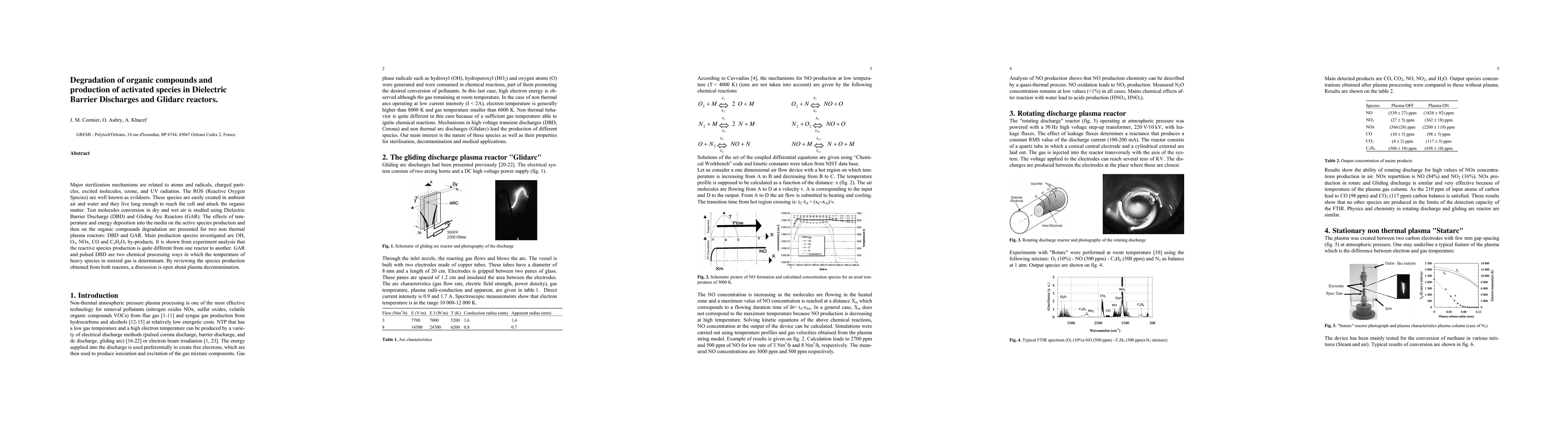This paper investigates the degradation of organic compounds and production of reactive species in two non-thermal plasma reactors: Dielectric Barrier Discharges (DBD) and Gliding Arc Reactors (GAR). It highlights the differing production of reactive species like OH, O3, NOx, CO, and CxHyOz, and discusses their impact on organic compound degradation, emphasizing the role of temperature and energy deposition in plasma decontamination.