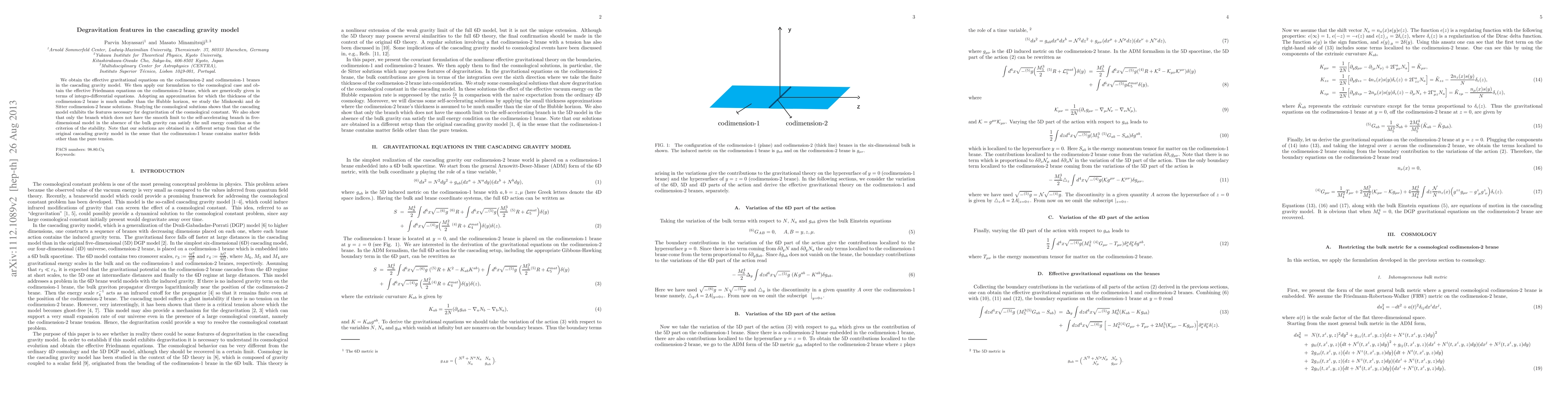 We obtain the effective gravitational equations on the codimension-2 and codimension-1 branes in the cascading gravity model. We then apply our formulation to the cosmological case and obtain the effective Friedmann equations on the codimension-2 brane, which are generically given in terms of integro-differential equations. Adopting an approximation for which the thickness of the codimension-2 brane is much smaller than the Hubble horizon, we study the Minkowski and de Sitter codimension-2 brane solutions. Studying the cosmological solutions shows that the cascading model exhibits the features necessary for degravitation of the cosmological constant. We also show that only the branch which does not have the smooth limit to the self-accelerating branch in five-dimensional model in the absence of the bulk gravity can satisfy the null energy condition as the criterion of the stability. Note that our solutions are obtained in a different setup from that of the original cascading gravity model in the sense that the codimension-1 brane contains matter fields other than the pure tension.