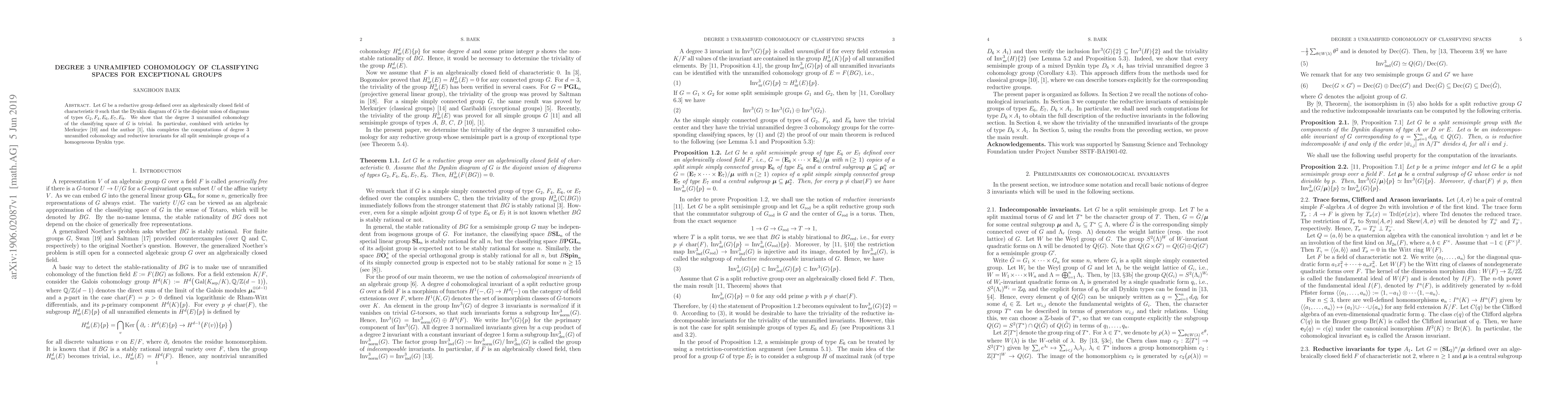 This paper demonstrates that the degree 3 unramified cohomology of classifying spaces for exceptional reductive groups (with Dynkin diagrams $G_2$, $F_4$, $E_6$, $E_7$, $E_8$) is trivial. This result, along with related works, completes the computation of degree 3 unramified cohomology and reductive invariants for all split semisimple groups of homogeneous Dynkin type.