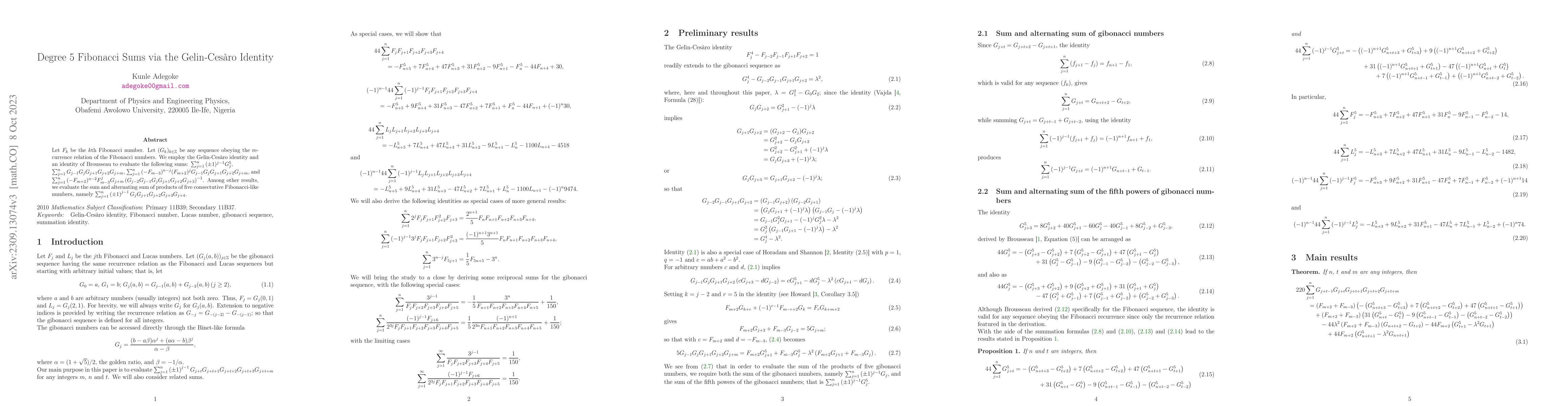 Let $F_k$ be the $k$th Fibonacci number. Let $(G_k)_{k\in\mathbb Z}$ be any sequence obeying the recurrence relation of the Fibonacci numbers. We employ the Gerin-Ces\`aro identity and an identity of Brousseau to evaluate the following sums: $\sum_{j=1}^n{(\pm 1)^{j - 1}G_j^5}$, $\sum_{j = 1}^n {G_{j - 1} G_{j} G_{j + 1} G_{j + 2} G_{j + m} }$, $\sum_{j = 1}^n {(-F_{m - 3})^{n - j} ( F_{m + 2} )^j G_{j - 1} G_{j} G_{j + 1} G_{j + 2} G_{j + m} }$, and $\sum_{j = 1}^n {(-F_{m + 2})^{n - 2}F_{m - 3}^jG_{j + m} \left( {G_{j - 2} G_{j - 1} G_j G_{j + 1} G_{j + 2} G_{j + 3} } \right)^{ - 1} }$. Among other results, we evaluate the sum and alternating sum of products of five consectutive Fibonacci-like numbers, namely $\sum_{j = 1}^n {\left( { \pm 1} \right)^{j - 1} G_j G_{j + 1} G_{j + 2} G_{j + 3} G_{j + 4} }$.