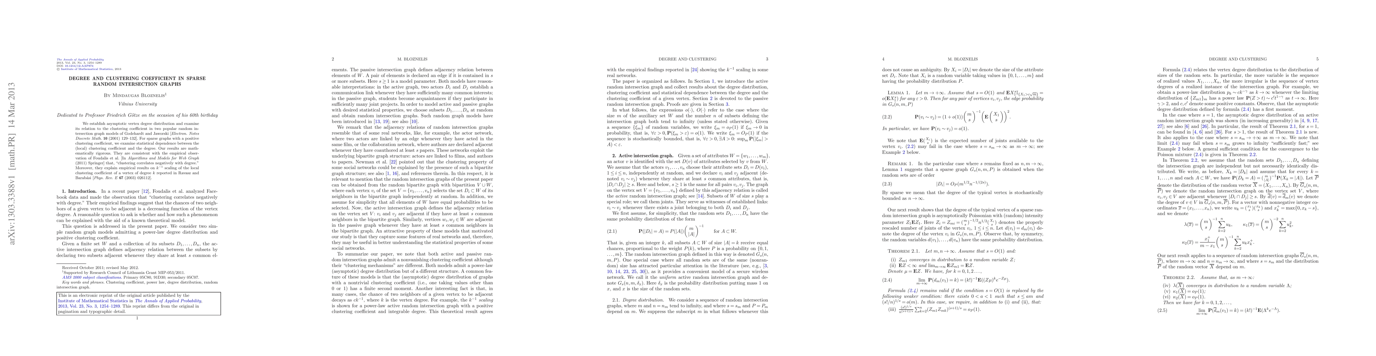 This paper rigorously analyzes the degree distribution and clustering coefficient in sparse random intersection graphs, revealing a negative correlation between clustering and vertex degree. The findings align with empirical observations and explain the $k^{-1}$ scaling of local clustering in high-degree vertices.